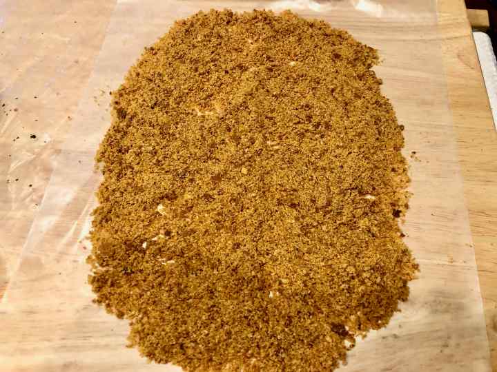 4- Spread the breadcrumbs on a length of wax paper or aluminum foil. Roll the meat over the bread crumbs so that the crumbs will cover it and adhere to it all over.