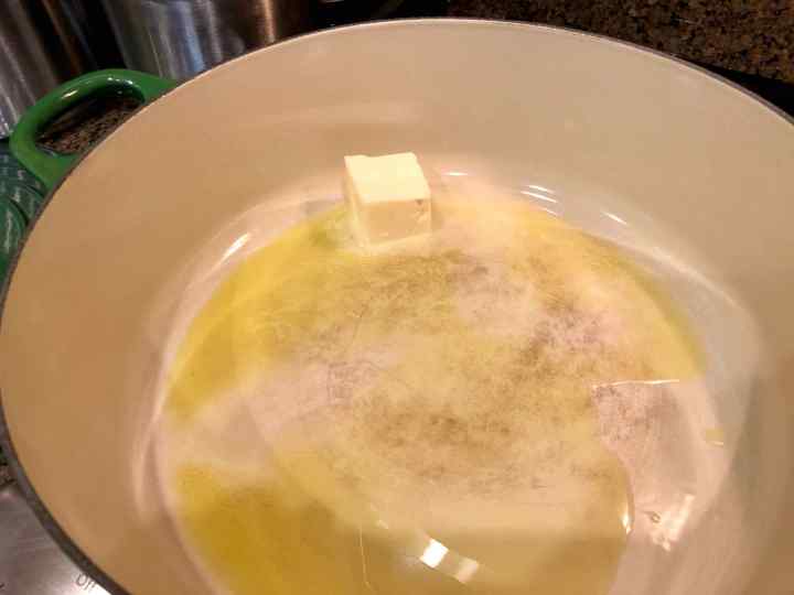 5- Choose a lidded pot that can subsequently accommodate the veal roll with enough room for it to be turned. Put in the butter and the oil and turn on the heat to medium high.