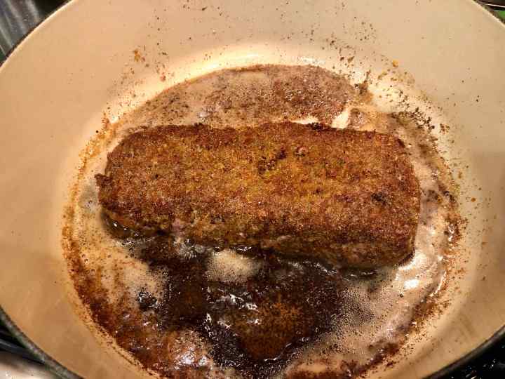 6- When the butter foam subsides, put in the meat keeping the pot uncovered. Brown it well on one side, then turn it over. Turning it requires care to avoid breaking up the roll. Try using a spatula in either hand and handle int very gently.