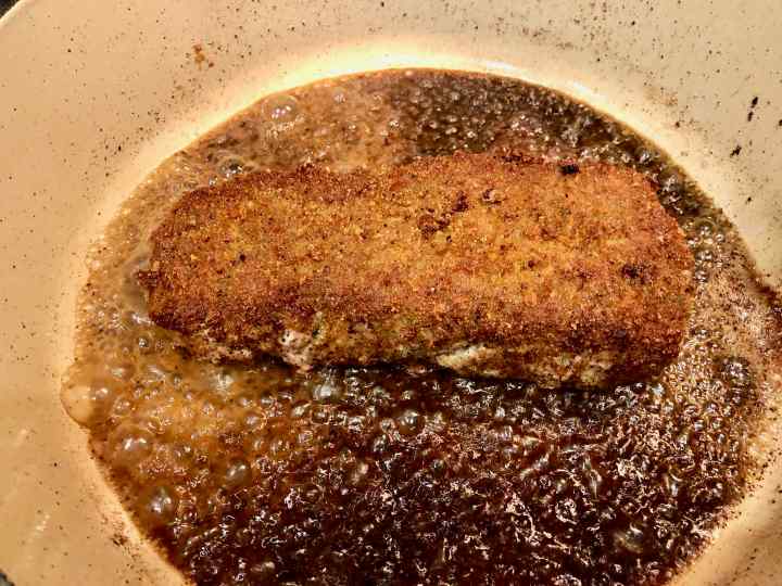 Lightly toasted breadcrumbs are used as a coating for the loaf, which is then browned in butter and then slowly simmered in white wine for about an hour.