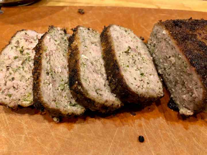 8- Transfer to a serving platter. Let the meat rest for for a few minutes, then slice it. Pour the pan juices over it and serve. It is equally good hot, lukewarm, or at room temperature. (I poured the pan juices through a fine sieve to remove the residual bread crumbs, which were quite dark.)