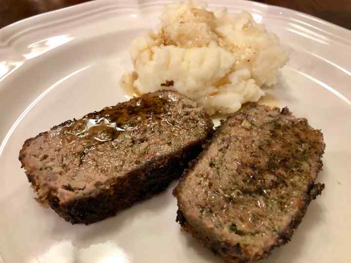 If you have the required gear and are able to find sufficient leaves, I highly recommend trying this recipe. The meat loaf tastes more like a moist veal roast with plenty of meaty flavor, complemented nicely by the herbs and buttery, nutty pan juices. I chose to serve the loaf with creamy mashed potatoes seasoned with truffle salt.
