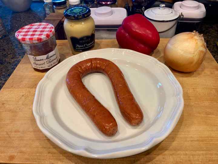 I’m happy to report that the results far exceeded our expectations. The flavors of the roasted pepper and onions were enhanced by the meaty flavors of the sausage, and the sweet-and-sour basting sauce glazing the kielbasa provided the perfect complement to its smokey savor.