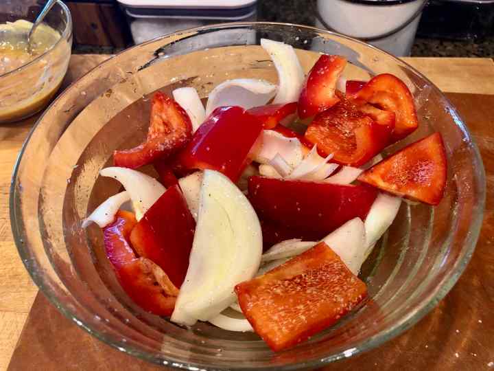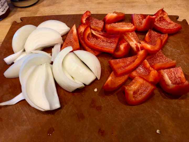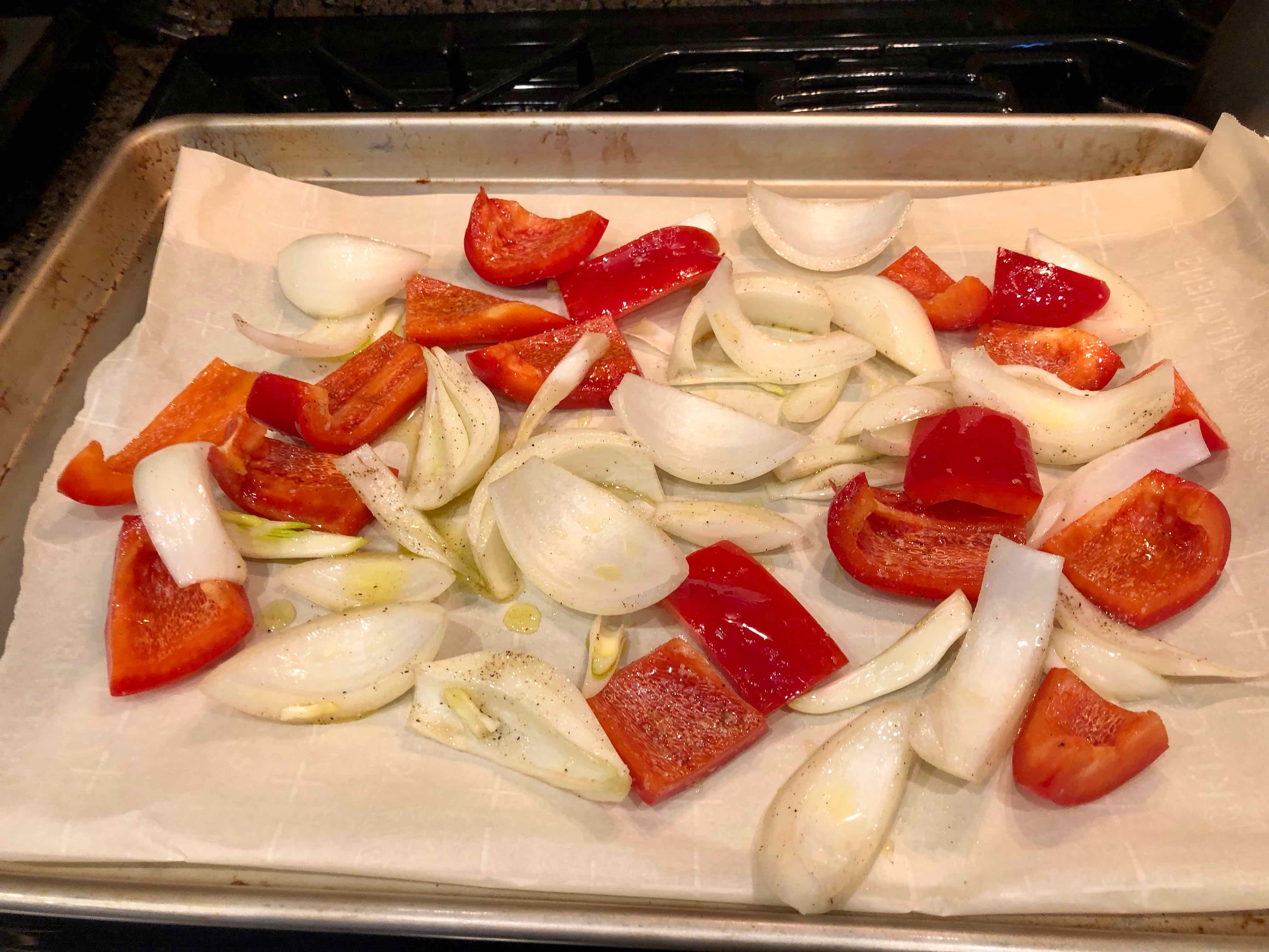 1) Get a sheet pan ripping hot in a 425-degree oven while you cut up a small onion and a bell pepper, whatever color you prefer. (I recommend cutting the vegetables into chunks.)