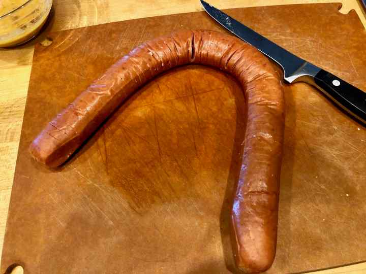 Hasselback Kielbasa (Adapted from a recipe by Sam Sifton from New York Times Cooking website.)