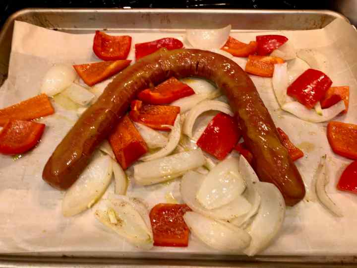 4) Now remove the vegetables from the oven, give them a stir, and put the kielbasa on top.