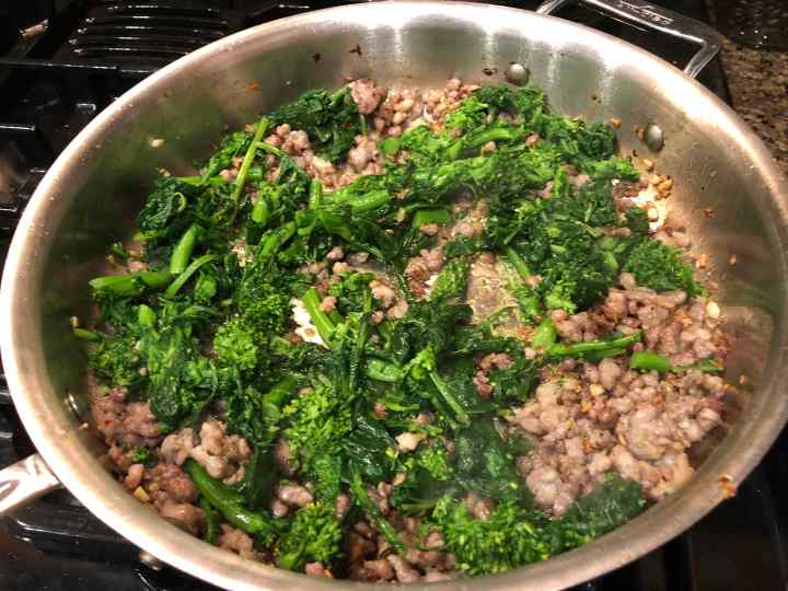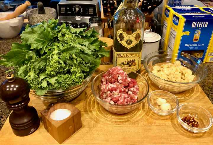 I’ve cooked this dish numerous times from childhood memories of it being made by aunt; however, it’s never been as good as the one I recently prepared using Scicolone’s recipe. I attribute the improvement over my original method both to the recipe’s parboiling the broccoli rabe and subsequently using the same water to cook the pasta and to its utilizing uncased sausage. The former step infuses the pasta with more flavor, and the latter extracts more flavor from, while adding texture to, the sausage.