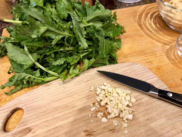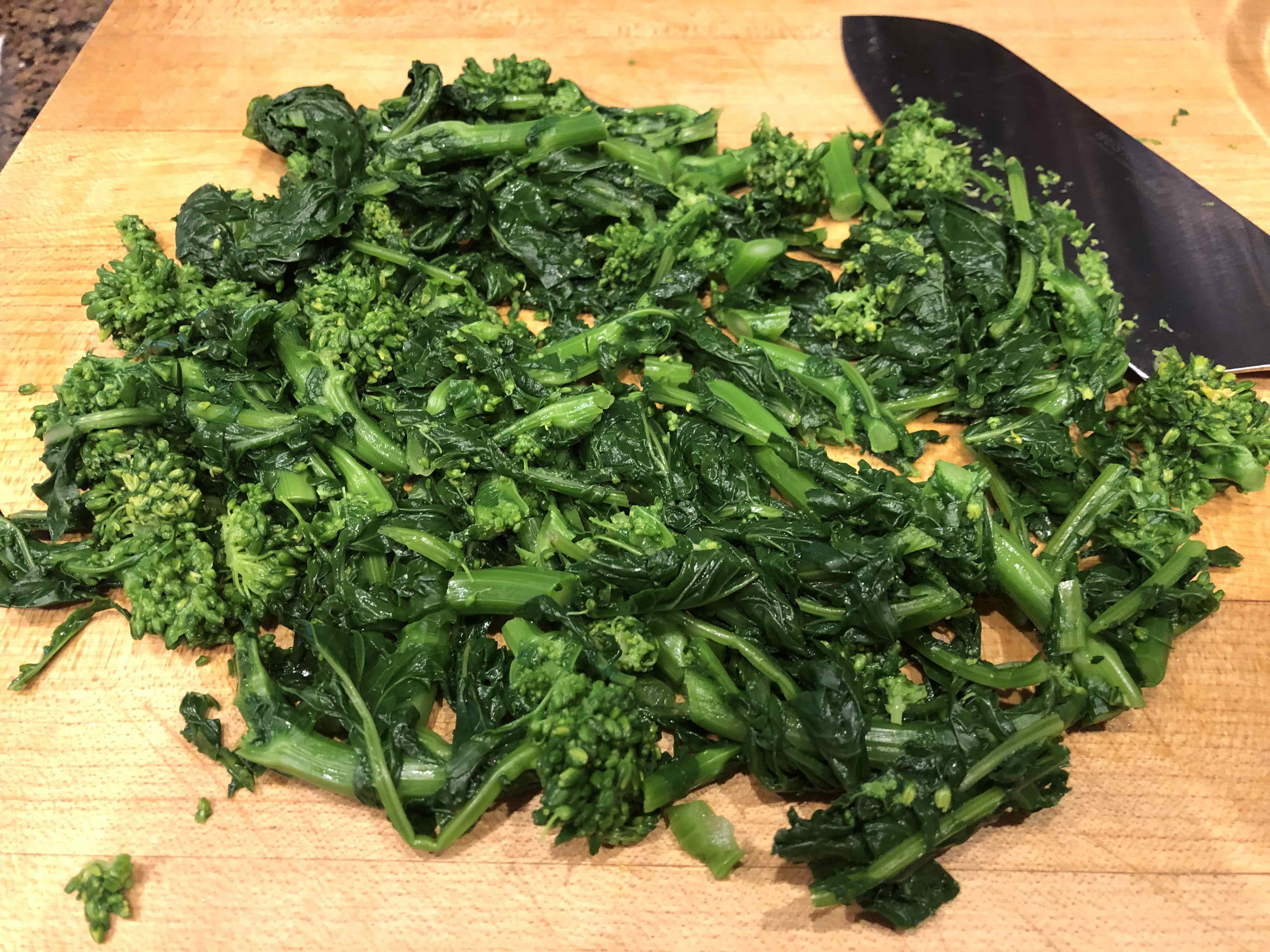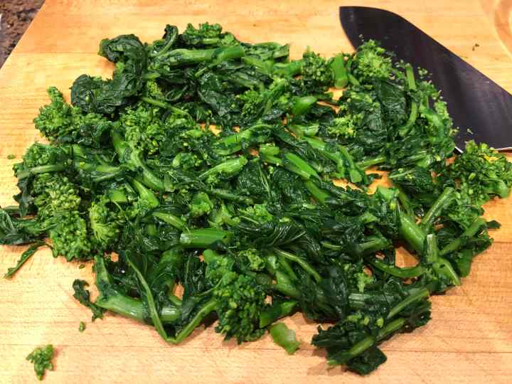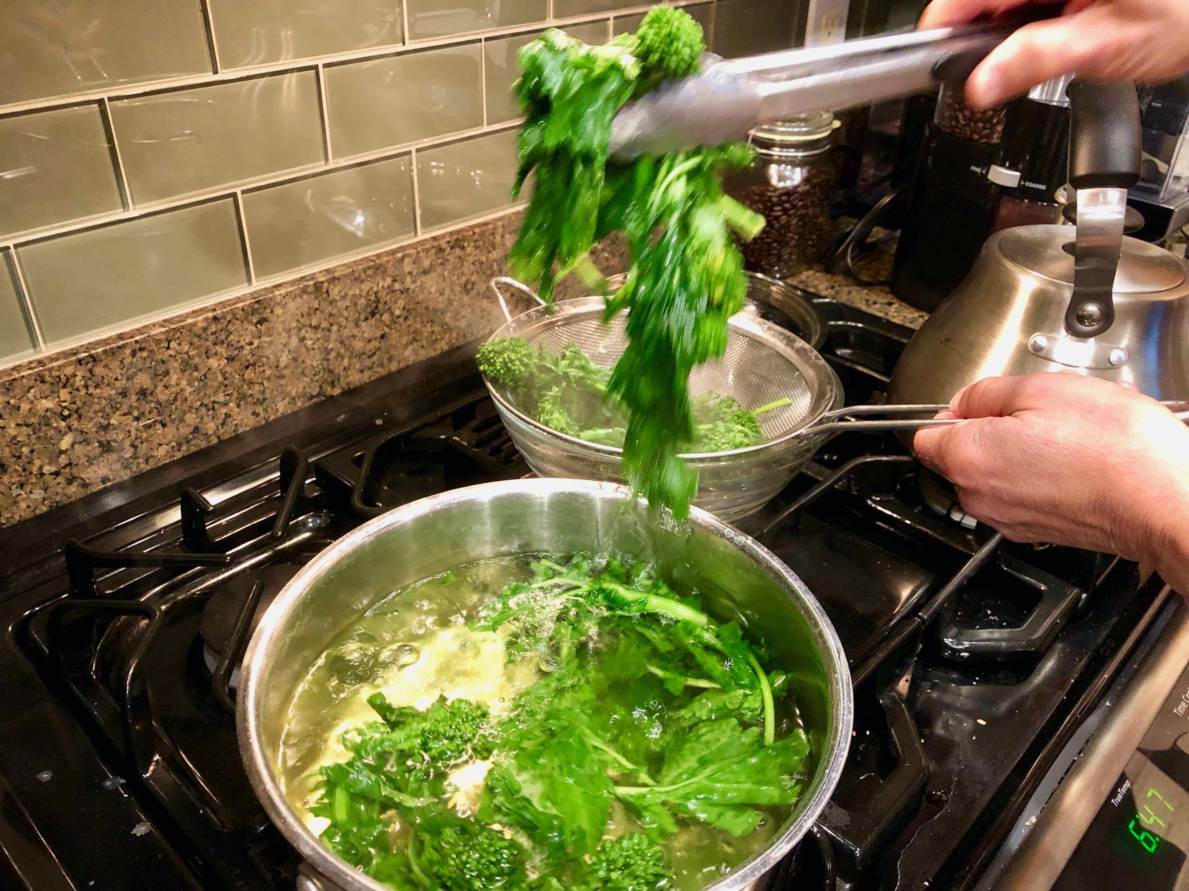 Using tongs or a wire-mesh skimmer, lift out the broccoli rabe into a sieve and cool it quickly under cold running water. Drain and squeeze gently to remove excess moisture. Chop coarsely and set aside.