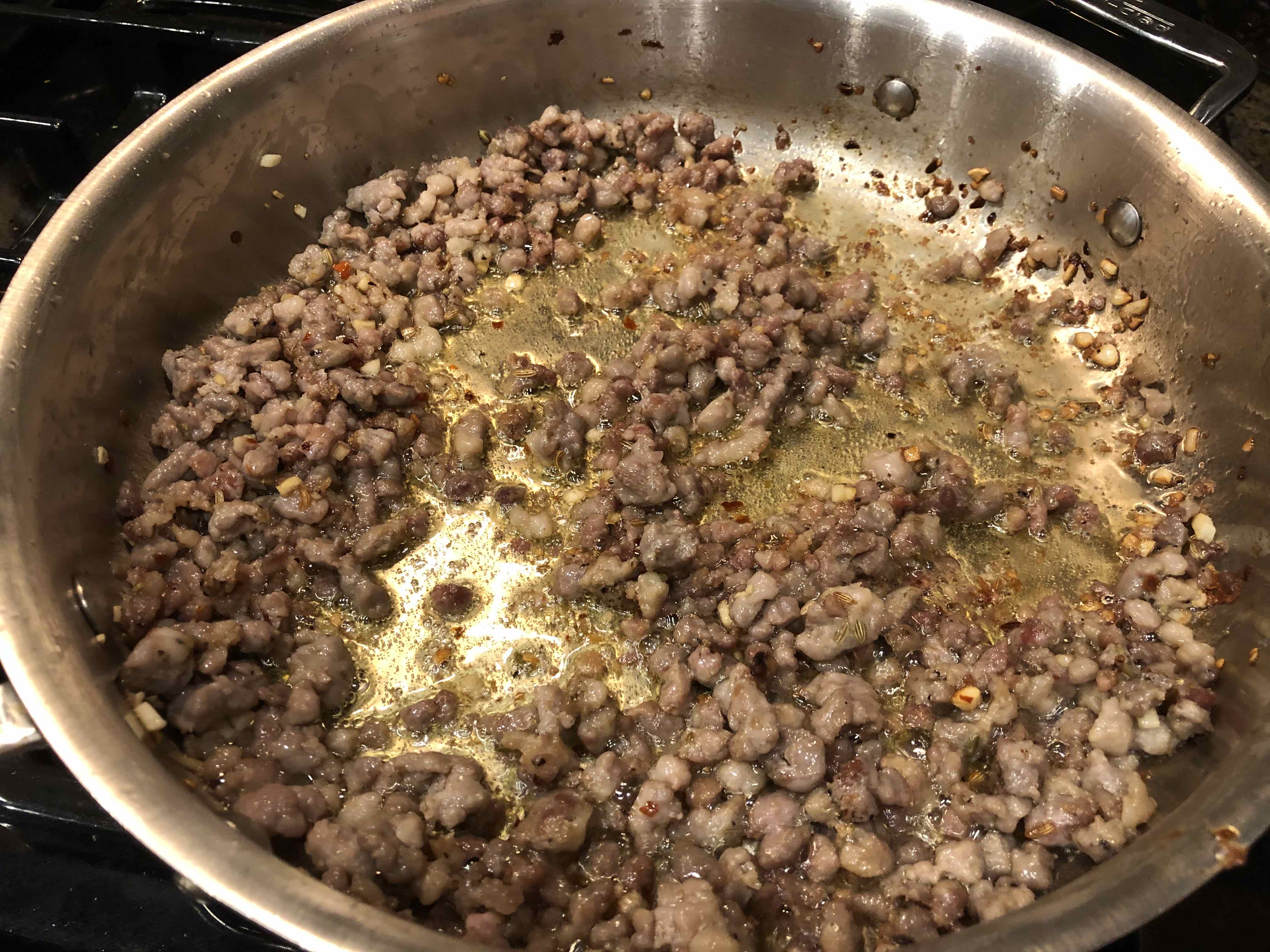 Meanwhile, in the skillet over medium-low heat, warm the 1/3 cup olive oil. Add the sausage, garlic and red pepper flakes and cook, stirring and breaking up the sausage meat with a wooden spoon, until the sausage is nicely browned, about 7-12 minutes.