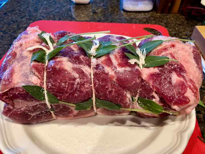 1. Season the pork with the salt, rubbing it into the meat. Arrange the sage leaves around the meat, tucking them under the twine. Let stand for 30 minutes.