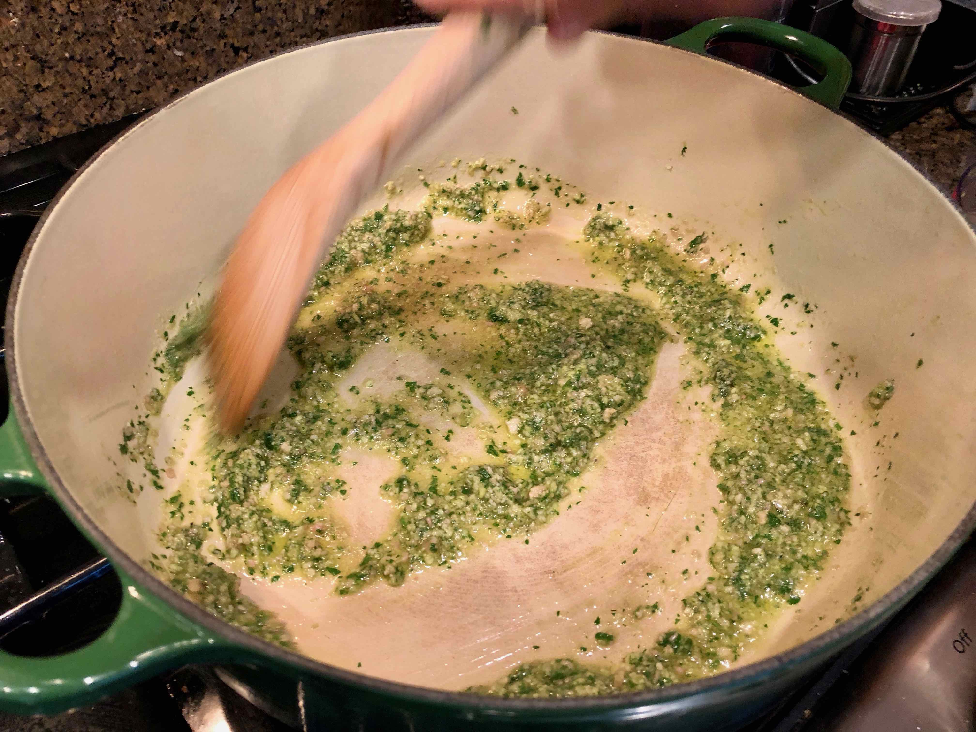 3. In a large, Dutch oven, heat the olive oil over medium-high heat until almost smoking. Add the garlic paste and cook until it has melted into the oil.