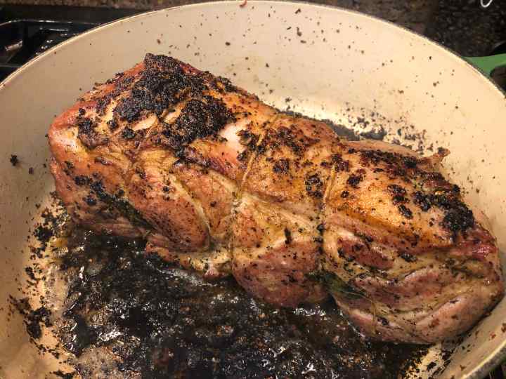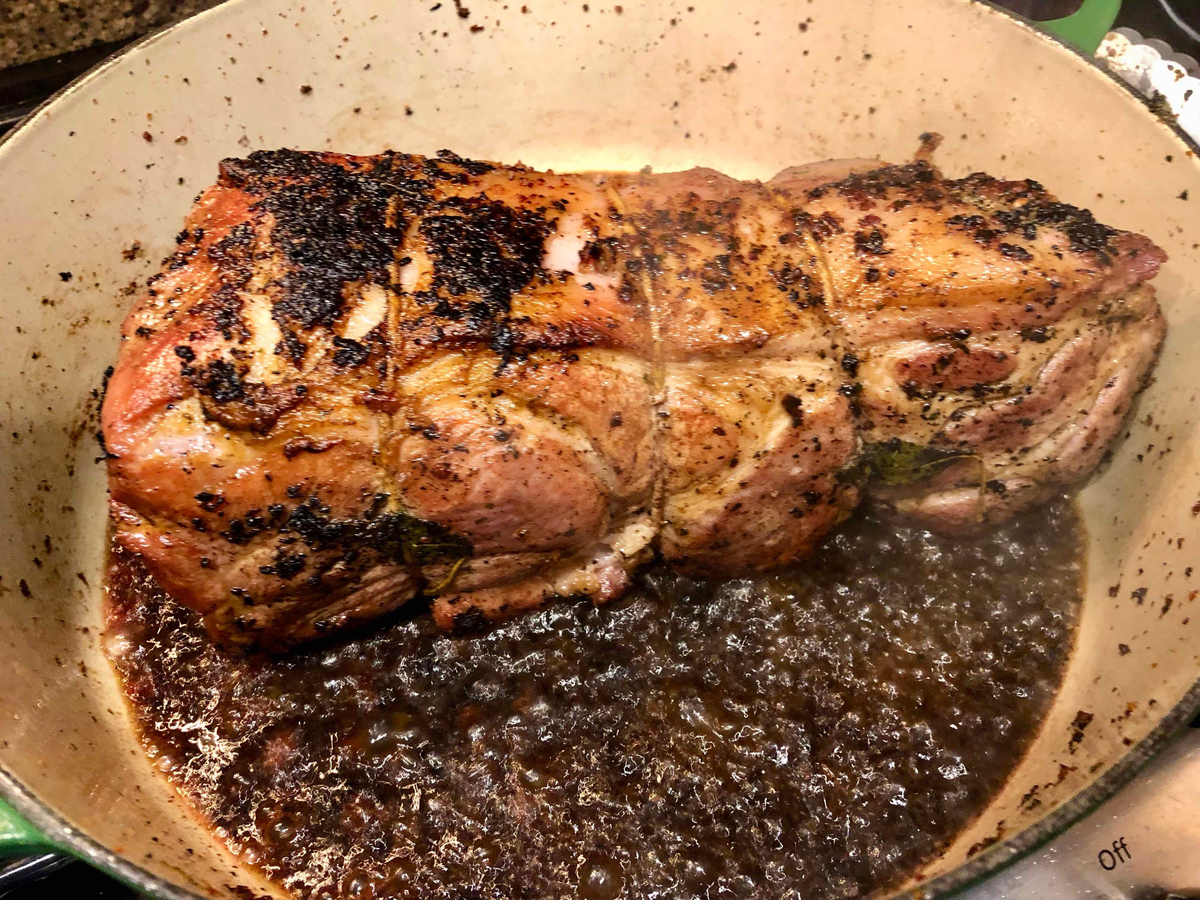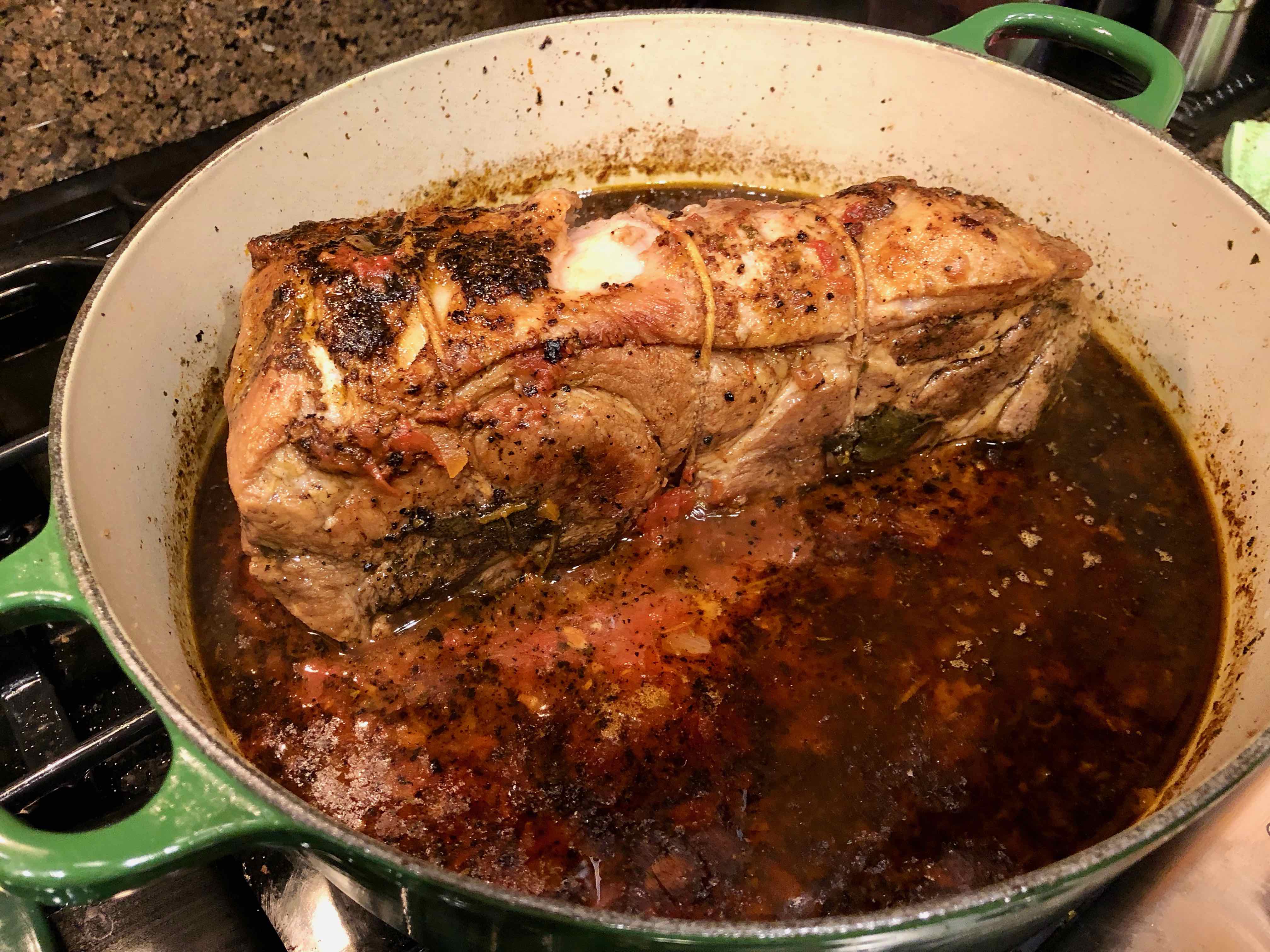 7. Cover the pot, lower the heat to a simmer, and cook until the meat is fork tender, about 2 hours. (My 4.3 pound bone-in roast took 3 hours to reach fork tender.)