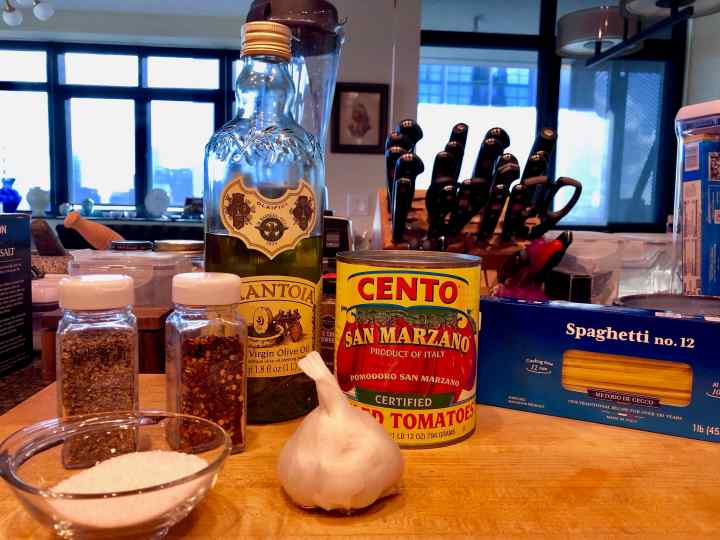 The recipe, for spaghetti marinara, called for just a few ingredients: a couple of tablespoons of olive oil, a clove of garlic, several canned Italian plum tomatoes, a pinch of oregano, salt (a pinch for the sauce, a handful for the spaghetti water), and of course the spaghetti. The speed with which he pulled this dish together was, for me as a kid, amazing. My aunt’s regular sauce typically took close to an hour.