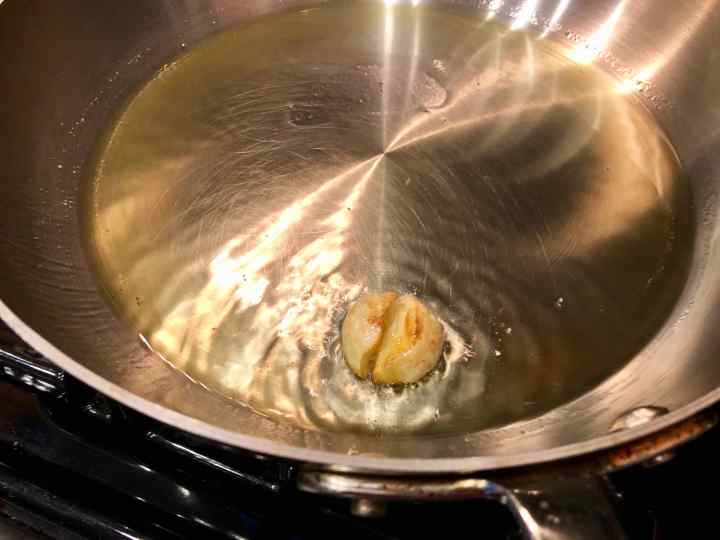 1. In a large skillet, over a medium high flame, heat the oil and garlic clove.