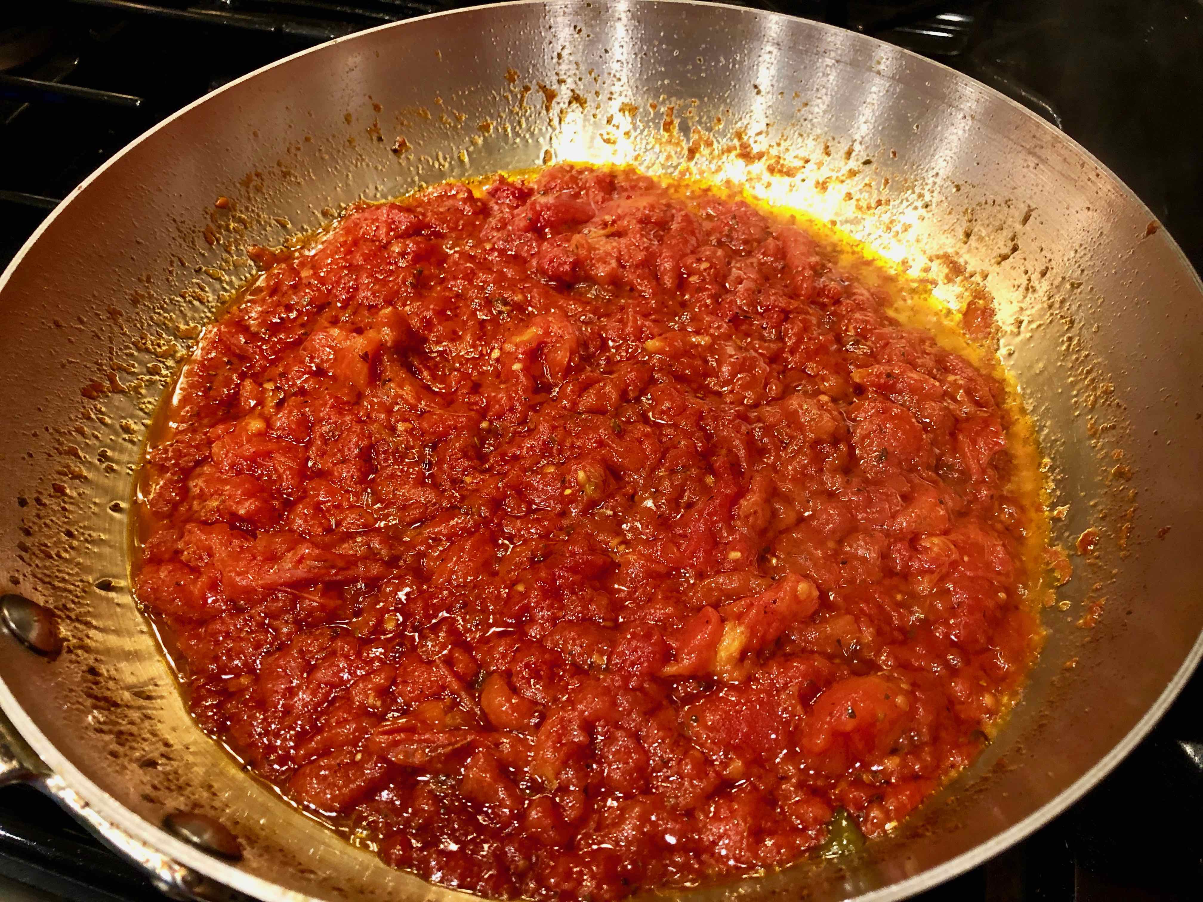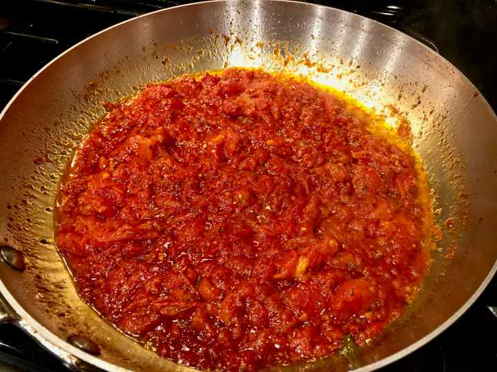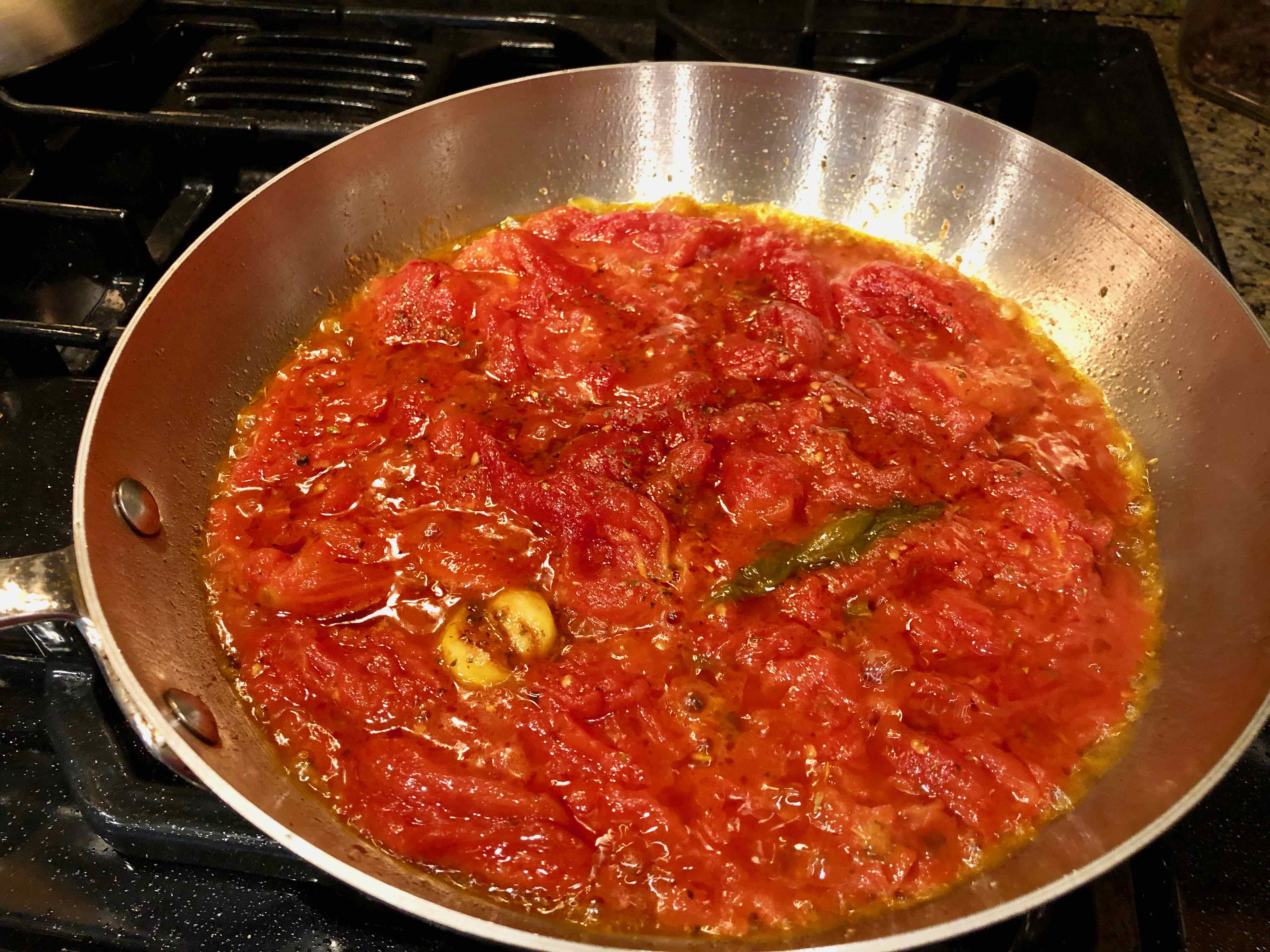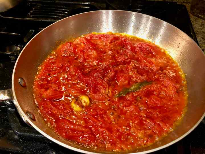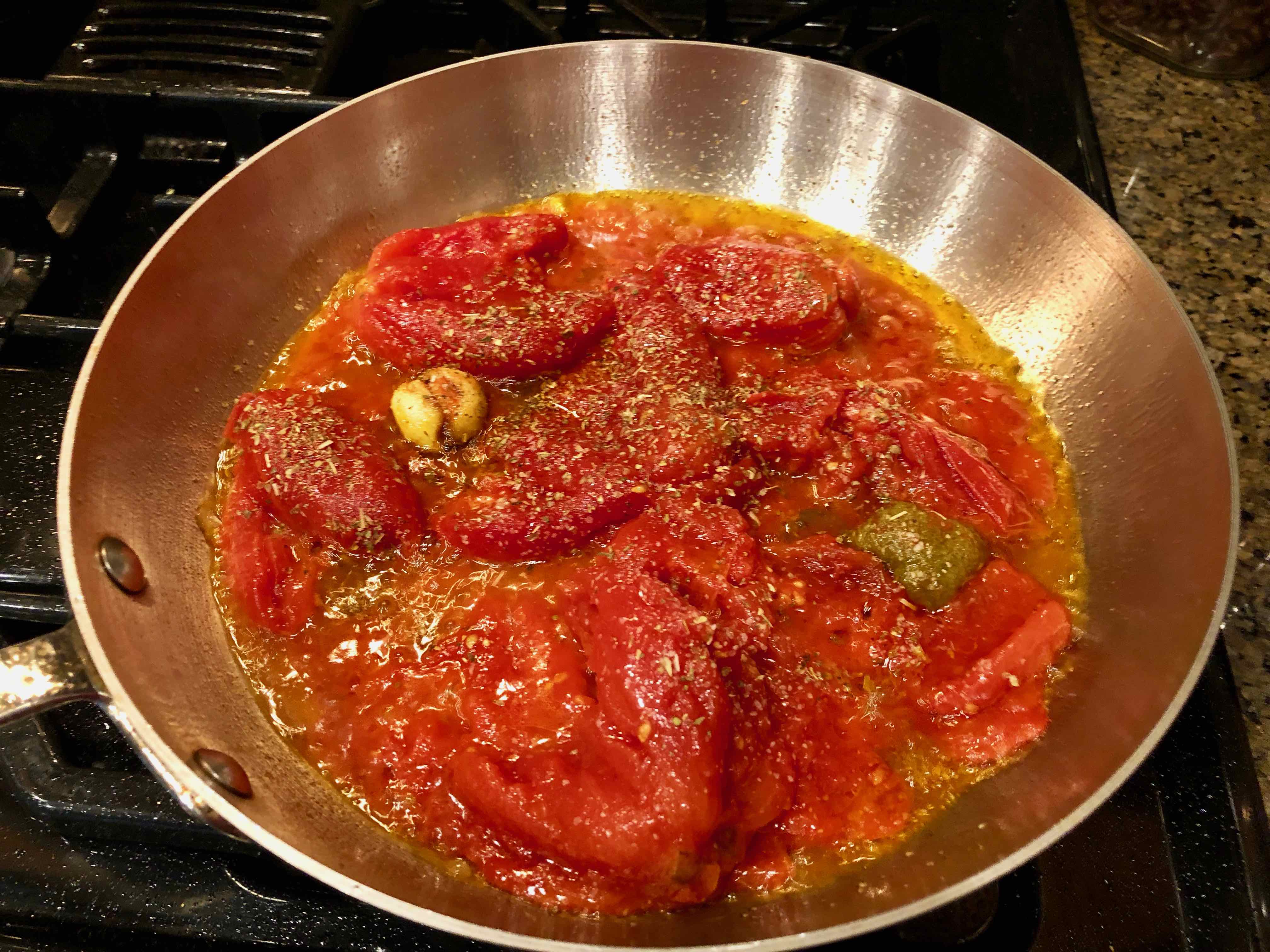 3. As soon as the garlic takes on some color, add the tomatoes, salt, and oregano (My canned tomatoes had basil leaves, which I let cook with the sauce and removed later.)