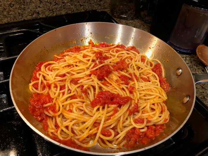 5. About 1 minute before the spaghetti reaches al dente, using tongs, transfer it to the skillet with the sauce. Toss the spaghetti in the sauce and let it finish cooking.