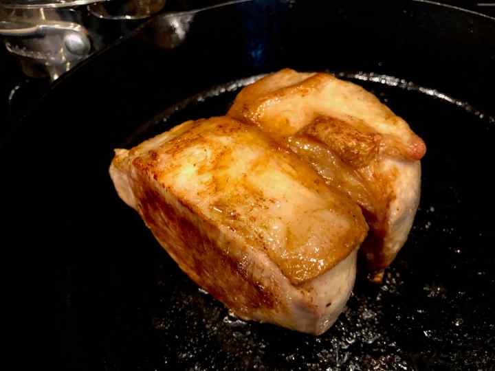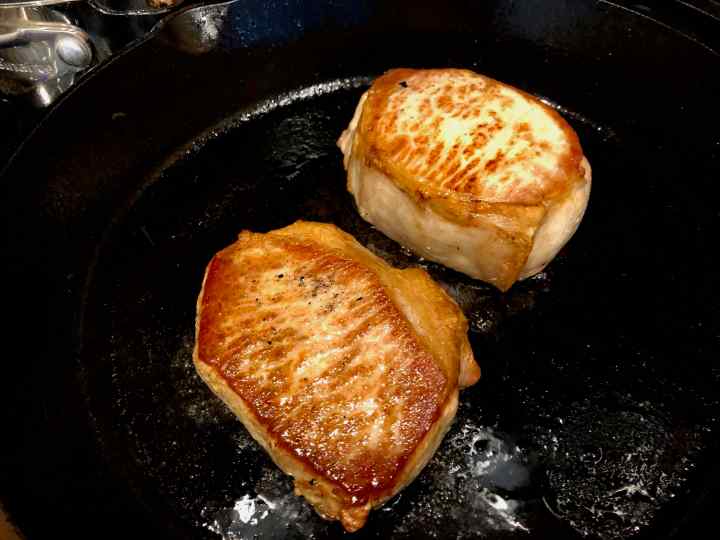 5. After taking the chops from the oven, I used the heat of the pan to brown the chops’ fat. Be careful here and use a pot holder to avoid getting burned on the extremely hot skillet.