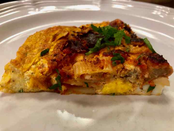 After a light crust formed on the pasta, I added the egg mixture and, over a medium-low flame, cooked the frittata, pushing the cooked portion towards the center of the pan while letting the uncooked eggs slide down along the edges. When most of the eggs had set and the edges of the frittata had taken on some color, I placed a lightly oiled pizza pan over the skillet, flipped the frittata, and slid it back into the skillet to brown the uncooked side.