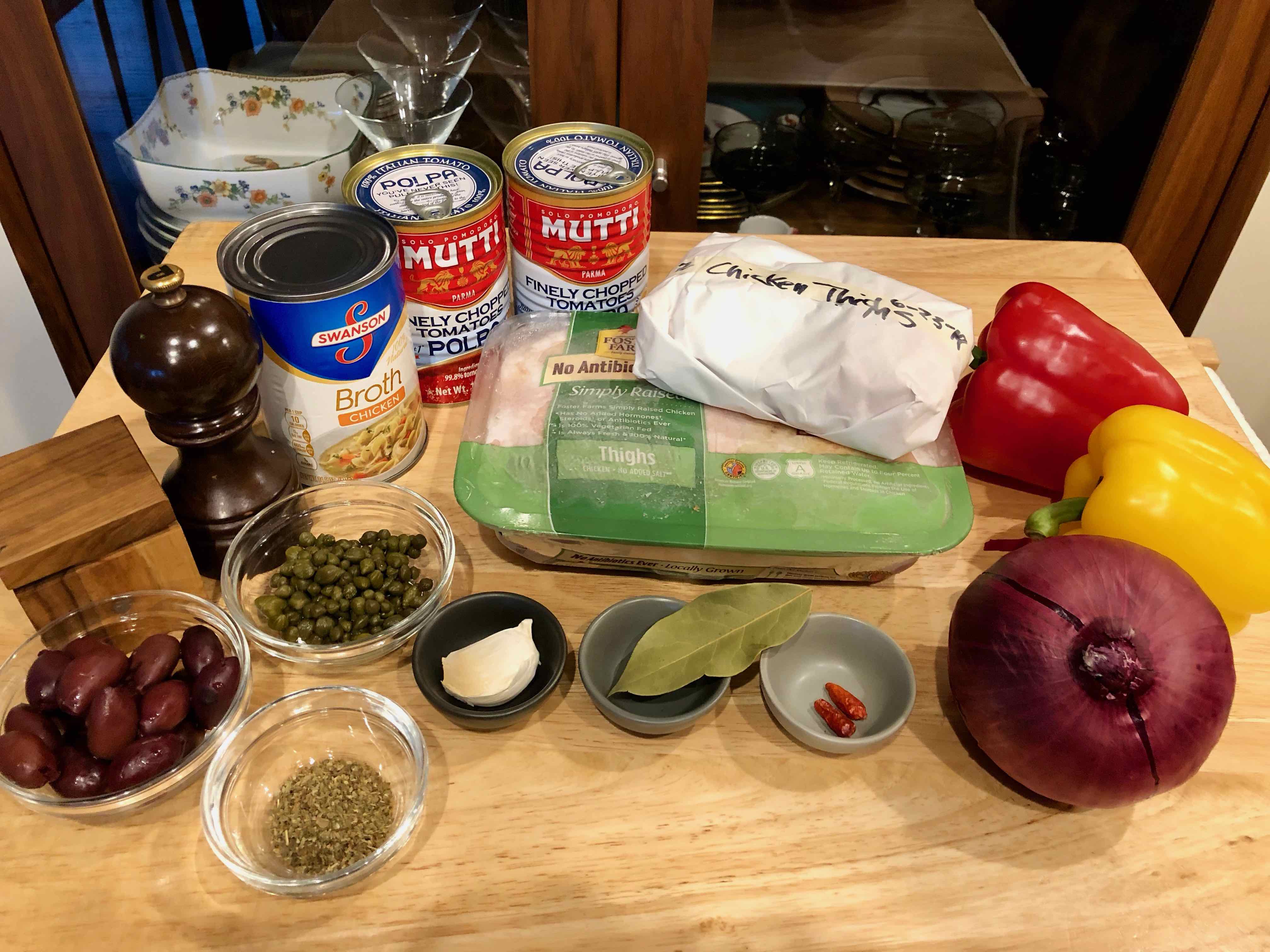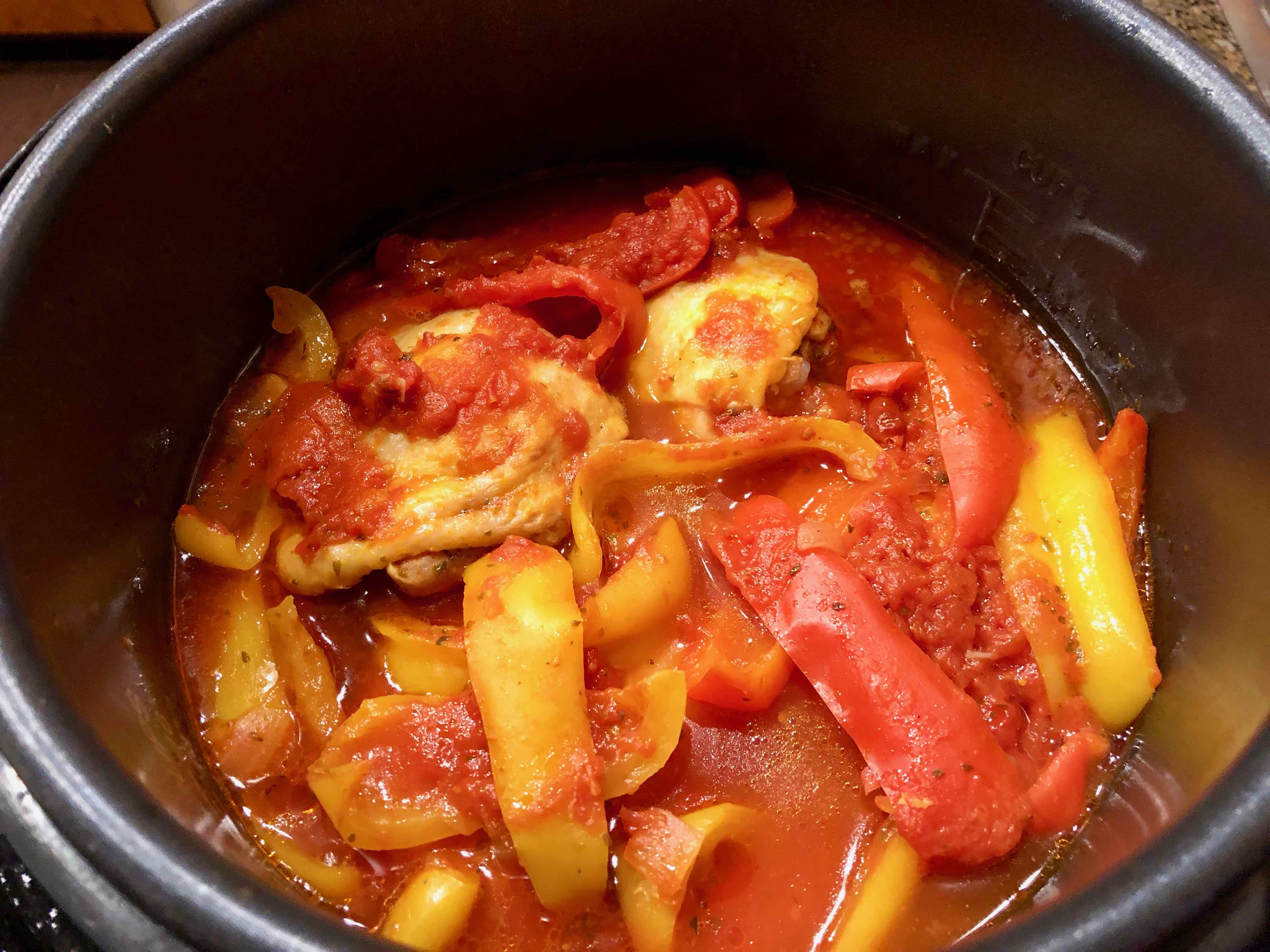 The only protein I had in sufficient quantity was some frozen chicken, which led me to a pressure-cooker recipe in my files for a “30-minute cacciatore.” All the ingredients it called for were on hand; in addition to the chicken, it needed stock, canned tomatoes, onion, garlic, oregano, bay leaf, and some black olives. I also thought that a couple of bell peppers I found in the fridge would extend the dish as well as add flavor. For a starch, some whole wheat couscous in my pantry would have to do.