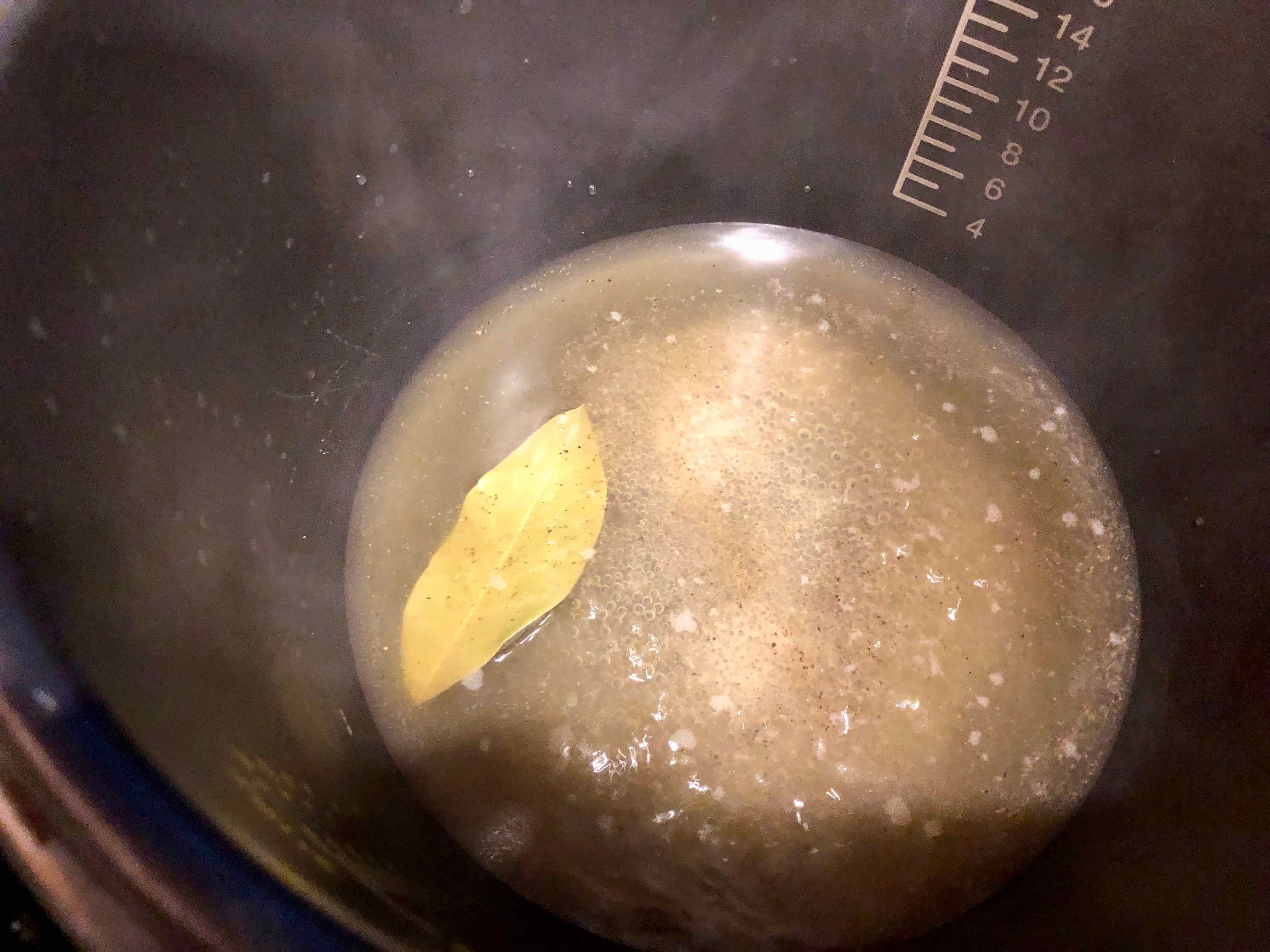 2. Add chicken stock, salt, and bay leaf and mix well.