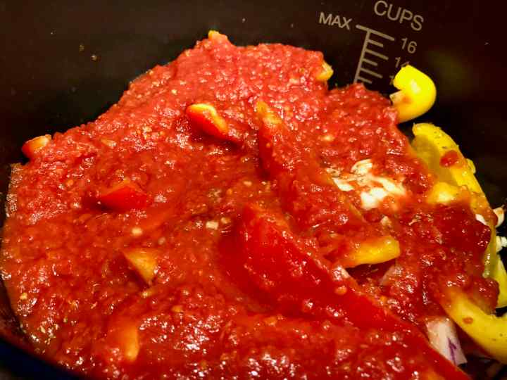As I went along, I made a few substitution and changes to the recipe. I used imported finely chopped tomatoes rather than the whole ones called for and red onion rather than yellow. To up the flavor, I substituted minced fresh garlic for the garlic powder, added a few tablespoons of capers, and tossed in two peperoncini for heat. Although I prefer a more traditional, stove-top preparation, with browned chicken pieces, this quick version, with frozen chicken, surpassed my expectations. And with my gracious, albeit forgetful, husband, who knows when I may need to make it again.