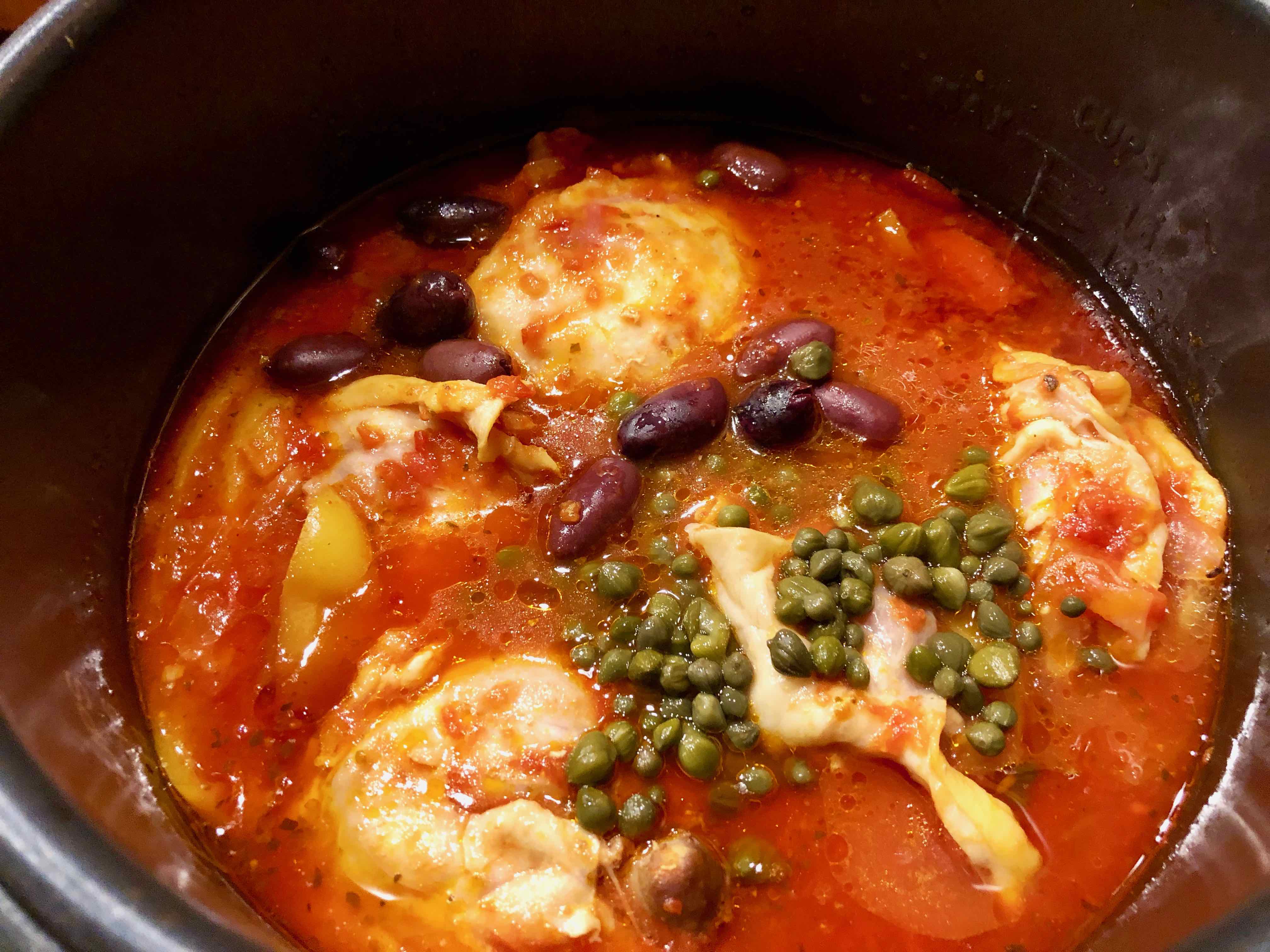 7. Add olives, capers, and reduce the cooking liquid. Serve over chicken and cooked pasta.
