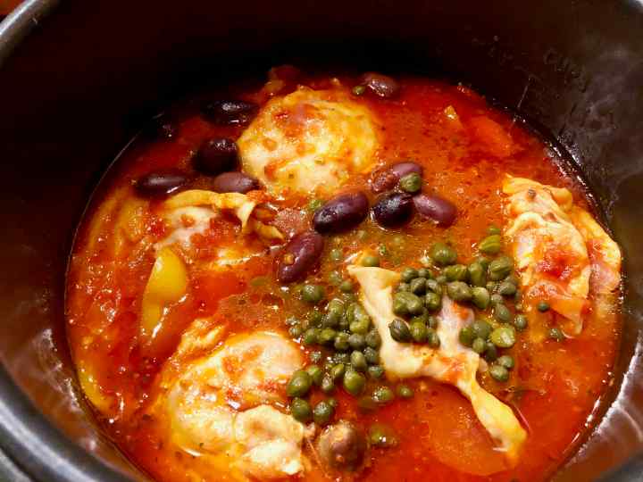 Within a half hour, the chicken was ready to go. I set the timer for 15 minutes under high pressure, knowing that, with the time it would take for the pot to reach pressure, I had at least three quarters of an hour before the final step of adding the olives and reducing the cooking liquid. Altogether, the dish took about an hour to complete and I left it on “Warm” while we had cocktails that were perfectly executed by my husband, who seemed quite relieved that we pulled this dinner off.