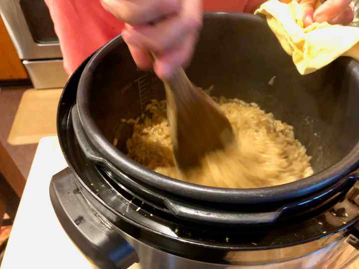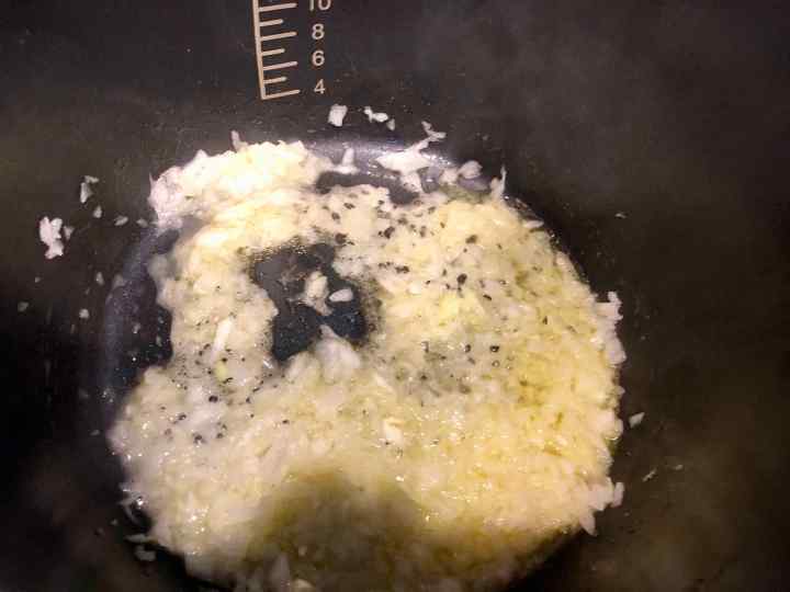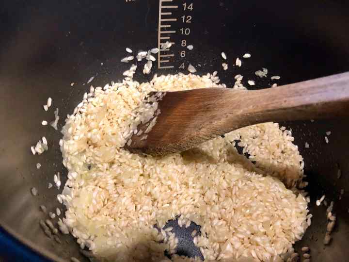 1. Heat the oil over high heat in a 2 1/2-quart or larger stove-top pressure cooker, or in an electric pressure cooker using the sauté function. Add the onions, and cook for 1 minute, stirring frequently. Stir in the rice, taking care to coat it with the oil. Cook for 30 seconds, stirring constantly. (I used a bit of butter and stirred the rice for closer to 2 minutes to fully coat it.)