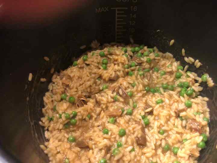 4. Set the cooker over medium-high heat or turn on the sauté function, and stir vigorously. The risotto will look fairly soupy at this point. Boil while stirring every minute or so, until the mixture thickens and the rice is tender but still chewy, 1 to 4 minutes. Stir in the peas when the rice is almost done. (if the mixture becomes dry before the rice is done, stir in the extra 1/2 cup of broth. The finished risotto should be slightly runny; it will continue to thicken as it sits on the plate.)