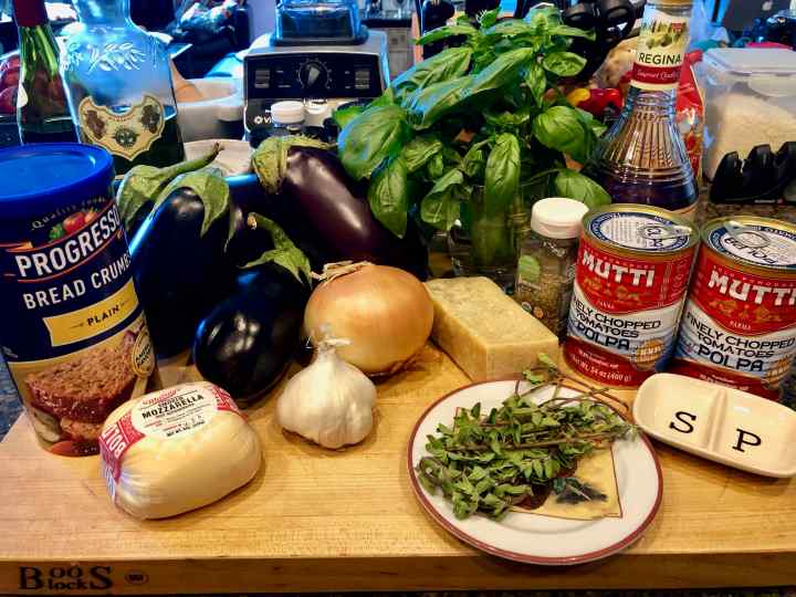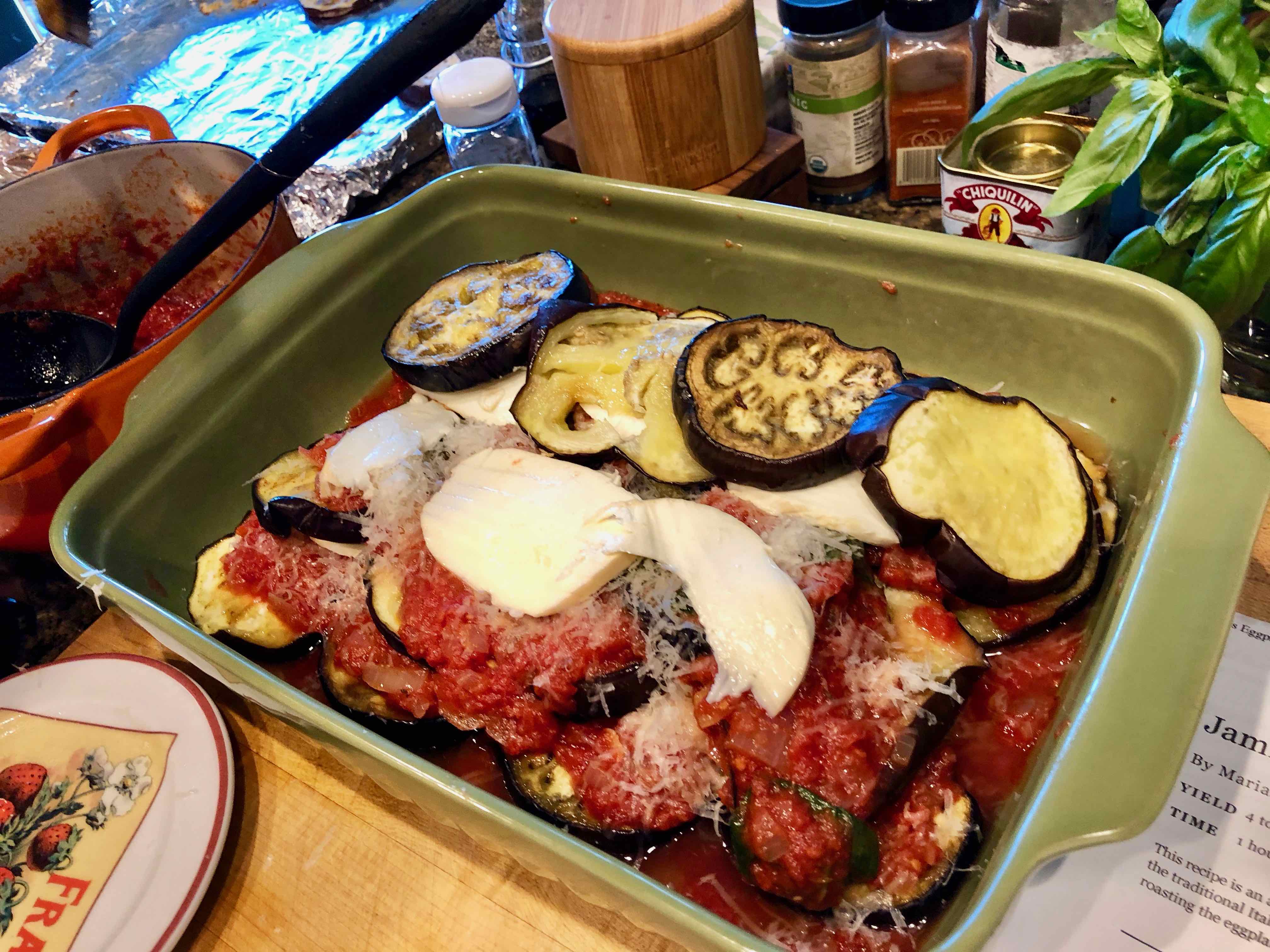 Painstakingly tending to the eggplant, and not being the best multi-tasker, also kept me from simultaneously making the tomato sauce, grating the cheese, and preparing the breadcrumbs. Ultimately, the dish, which I started at 4:37PM, was not ready for serving until 7:22PM. Having a patient husband, whose sense of humor, along with a proffered glass of wine, however, made the time pass quickly. Next time I make this parmigiana—and there will be a next time—I’ll start by making the sauce and prepping the dish’s other components, and then grill the eggplant on my trusty old grill pan. Nevertheless, when all is said and done, the Burros adaptation of the recipe yielded one of the finest eggplant parmigianas I’ve ever made.