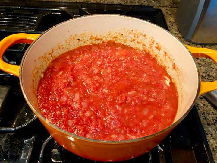 2. Meanwhile, in a large saucepan over medium heat, heat 2 tablespoons olive oil and add onion. Sauté until soft, about 10 minutes. Add garlic and dried oregano and sauté another 30 seconds. Add tomatoes and their juices, breaking up whole tomatoes with your hands. Cover, reduce heat to low, and simmer 15 to 20 minutes.