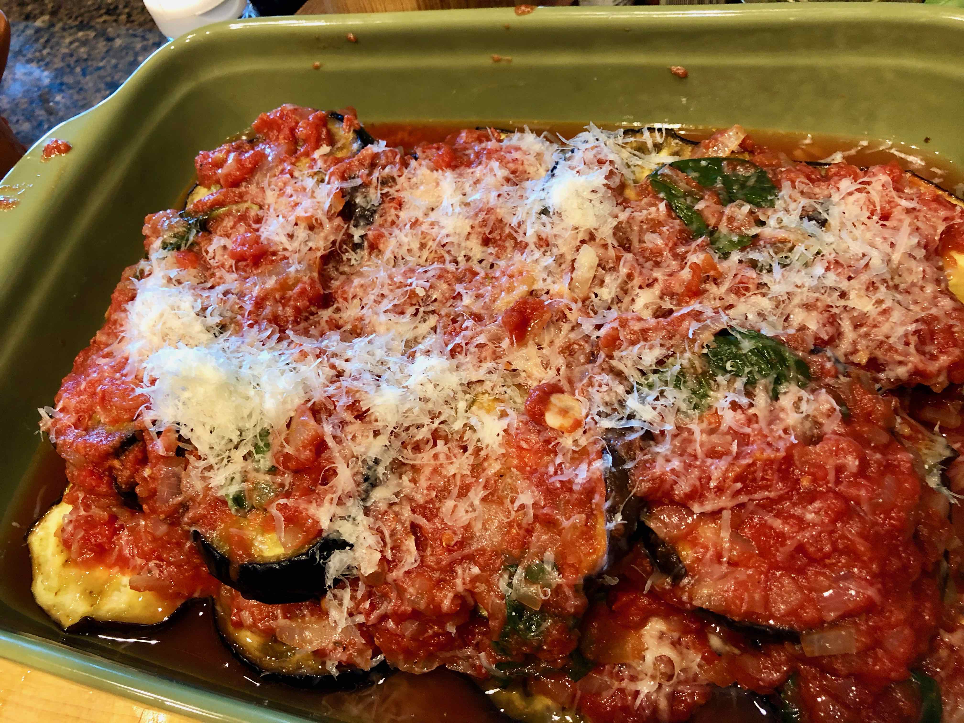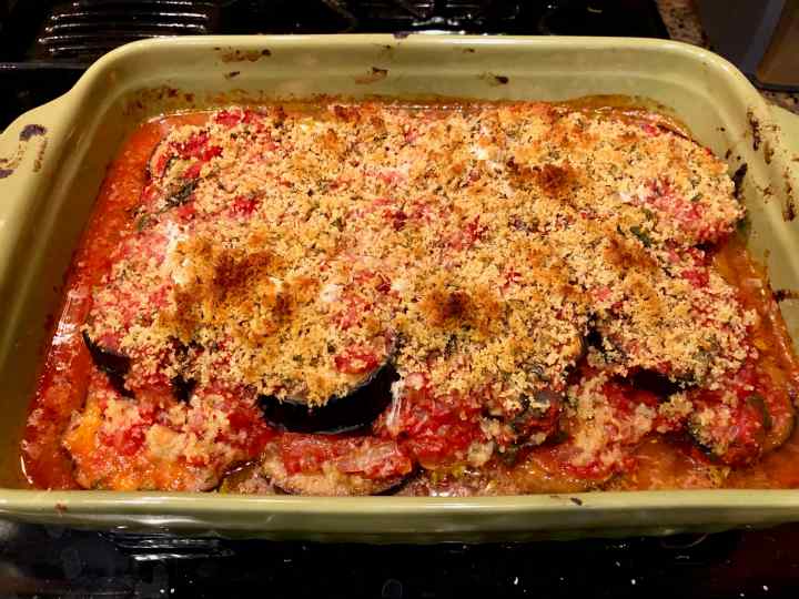 4. Bake until eggplant mixture is bubbly and center is hot, 30 to 45 minutes depending on size of pan and thickness of layers. Remove from heat and allow to rest for 5 minutes before serving. Recipe can also be reheated.