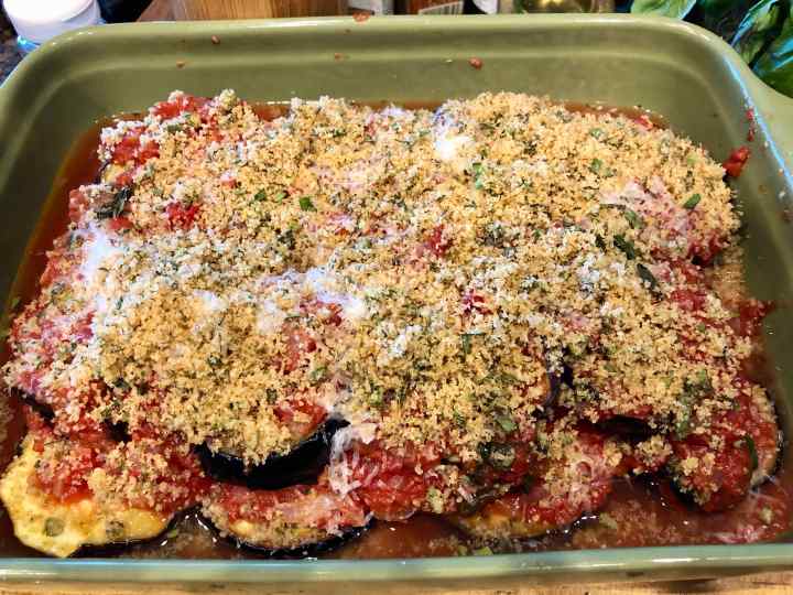 My only variation from the recipe below was adding thin slices of smoked mozzarella to the first two layers of eggplant. In fact, the original recipe from Jamie’s Italy, suggests an optional 5-ounce ball of buffalo mozzarella. I also recommend the fresh-oregano-leaves addition to the bread-crumb topping. Both the cheese and the fresh herb contributed significantly to the flavor and aroma of this dish.
