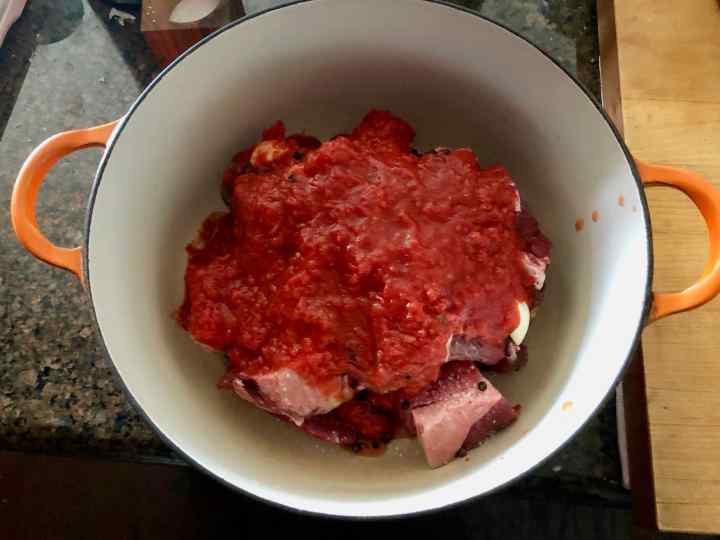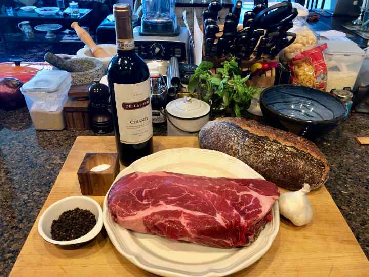 This stew has to be one of the easiest main courses I’ve ever prepared; the most tedious job was peeling all the cloves from a head of garlic. There are no vegetables to cut up, no herbs to chop, no browning of meat. Simply cut the beef into large chunks, place them in a heavy bottomed pot along with whole black peppercorns and garlic cloves, season with coarse salt, and cover it all with a bottle of Chianti. You might also add, as I did, a small can of chopped tomatoes, which, although not part of the original recipe, are widely used in Tuscany today.