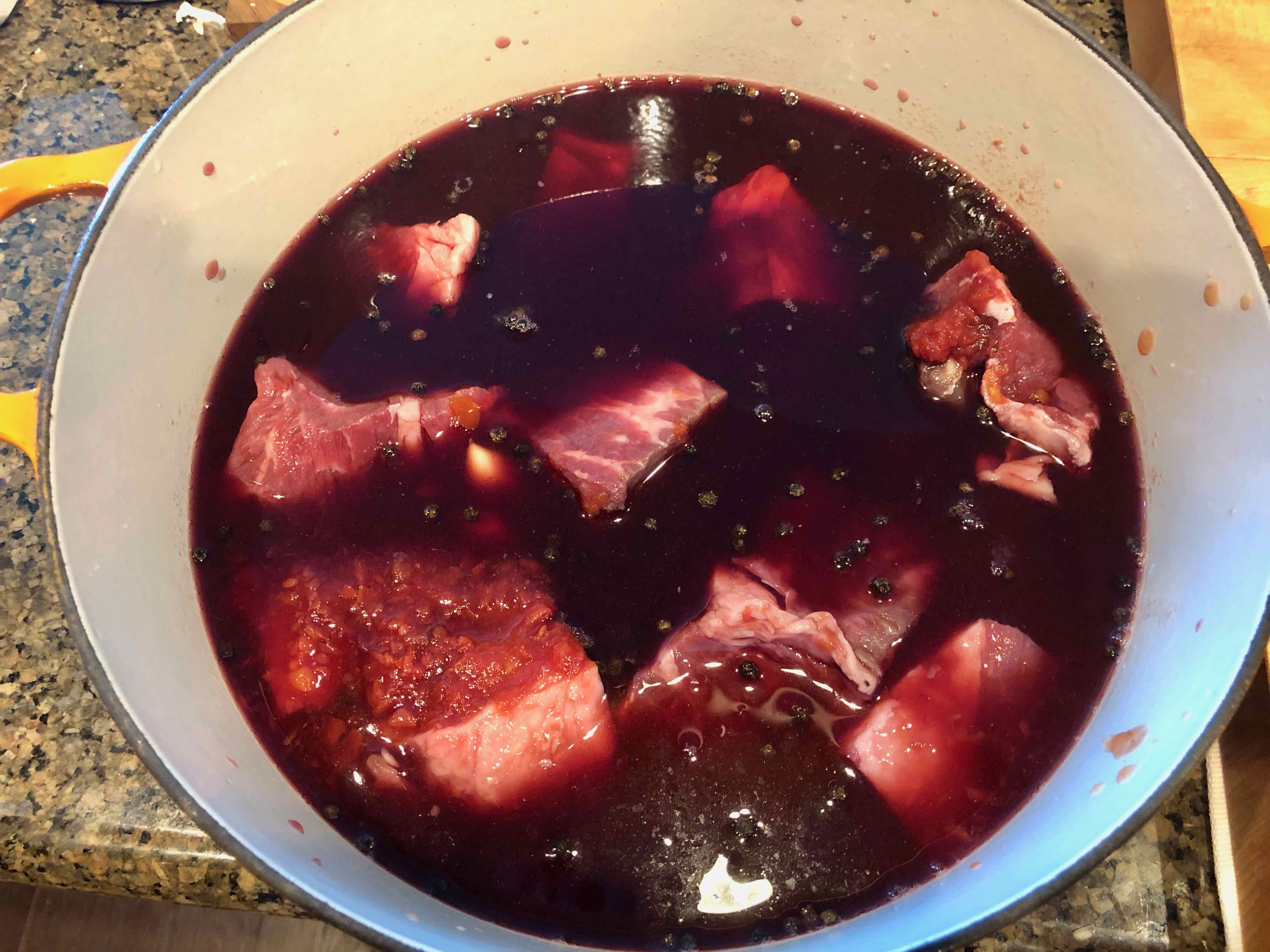 4. Pour in enough wine to cover the beef. I used a full bottle. You may need to push the chunks down a little so that they are covered by the wine.
