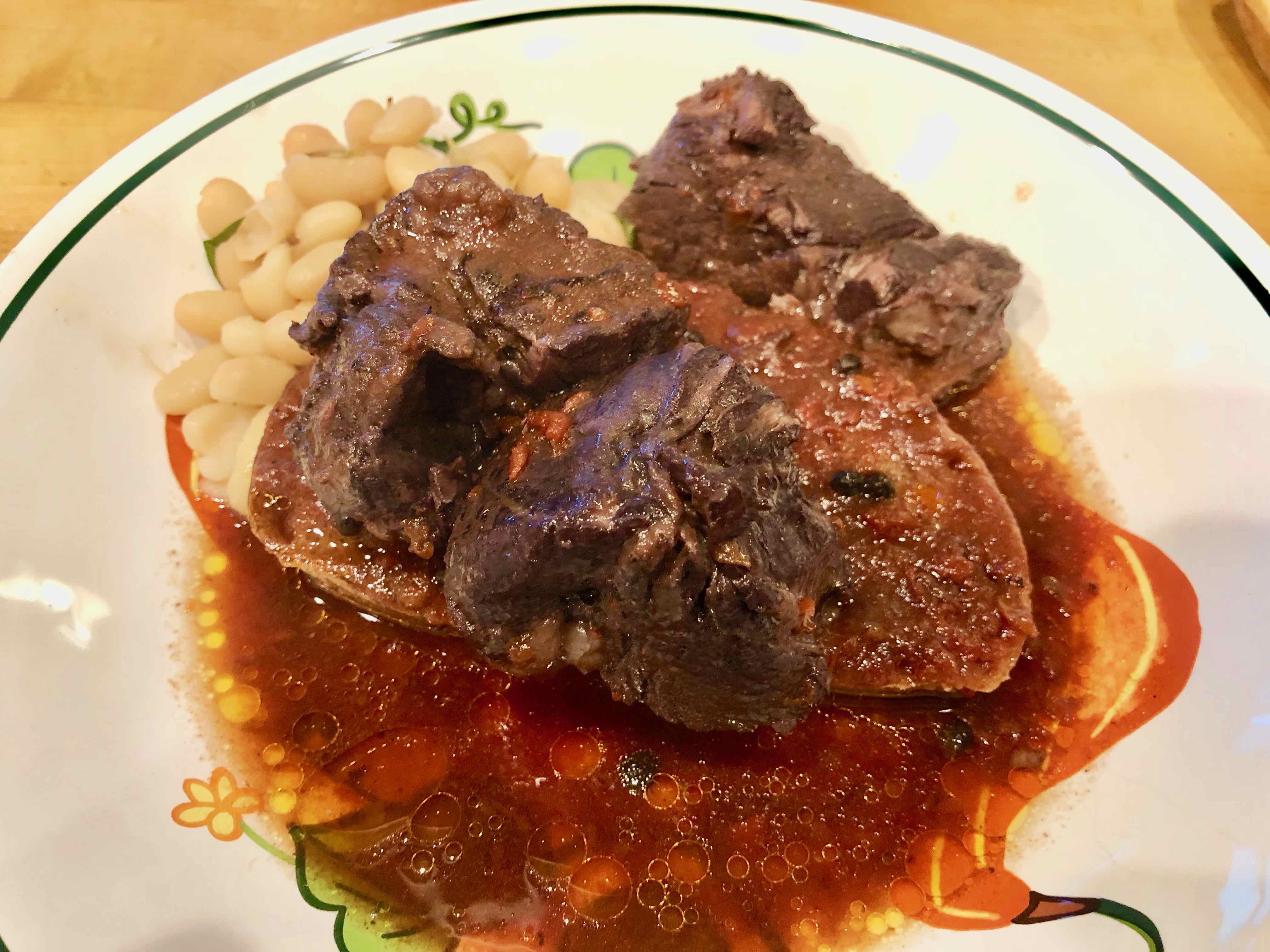 Next comes the hardest part: place the pot in a slow oven, 320°F, and wait four long hours, as tempting aromas of braising beef, simmering wine, succulent garlic, and pungent peppercorns drive you insane with hunger. The only accompaniment the dish needs is a thick slice of Tuscan bread placed in your bowl to sop up the delicious sauce. Cannellini beans, simmered with garlic, rosemary, and olive oil, might also serve as an appropriate side dish.