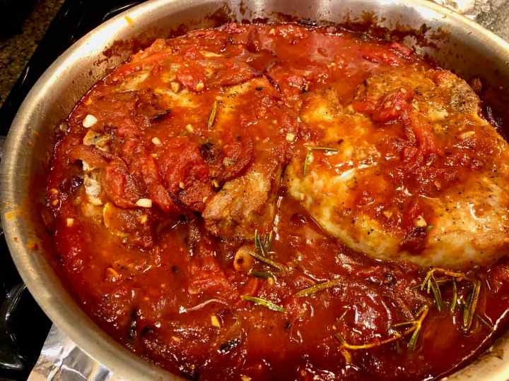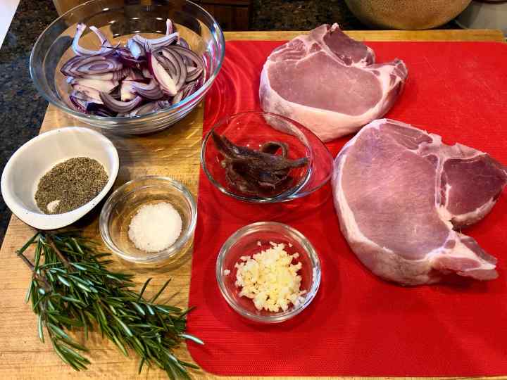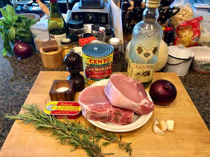Braised Pork Chops With Tomatoes, Anchovies, and Rosemary (from a recipe by Melissa Clark in the New York Times)