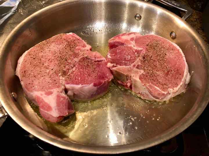 4. In a large, ovenproof skillet over medium-high heat, place 1 tablespoon oil. Sear chops until well browned, 3 to 4 minutes a side. Transfer to a plate.