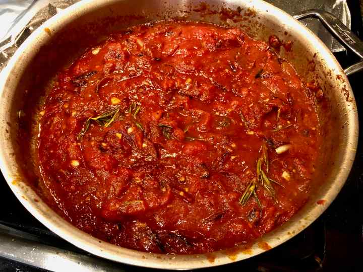 2 pounds plum tomatoes (preferably a mix of red and yellow), roughly chopped (I substituted a can of imported San Marzano tomatoes.)