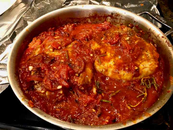 The anchovies and rosemary made for a nuanced sauce; and the relatively brief braise yielded nicely cooked chops that may have been even juicier had I taken them from the oven a little sooner. (With the recipe’s 15-minute cook time, my chops exceeded the ideal 145°F for pork by about 5 degrees.) Unable to find satisfactory plum tomatoes, I used a can of imported San Marzano tomatoes, which I think made for a richer sauce. In fact, there was so much sauce that, together with the gargantuan-sized chops, we have plenty of left overs for a mid-week pasta dish. While we were dining, my better half commented that the dish reminded him of one of his favorite casual New York City Italian restaurant’s pork chops pizzaiola, and I had to agree totally.