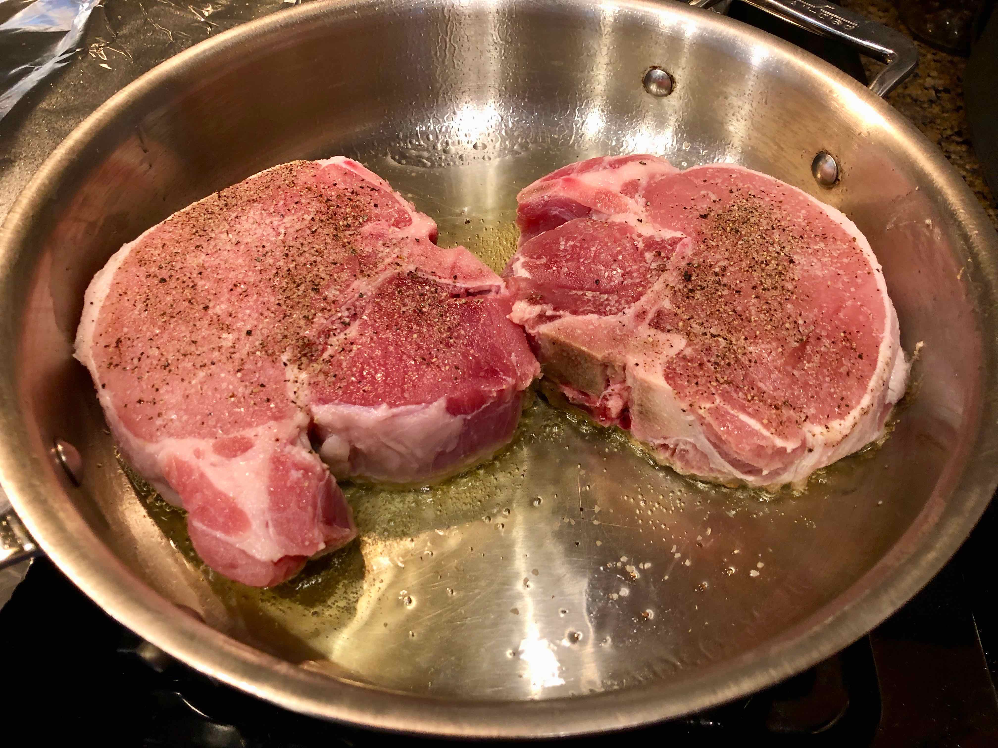 8. Add pork chops to skillet, spooning sauce over chops. Cover skillet and transfer to oven to bake until a thermometer inserted into center of meat reads 145 degrees, about 15 minutes. (When adding the pork chops, be sure to include any residual juices that may have accumulated on the plate.)