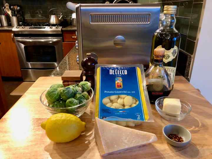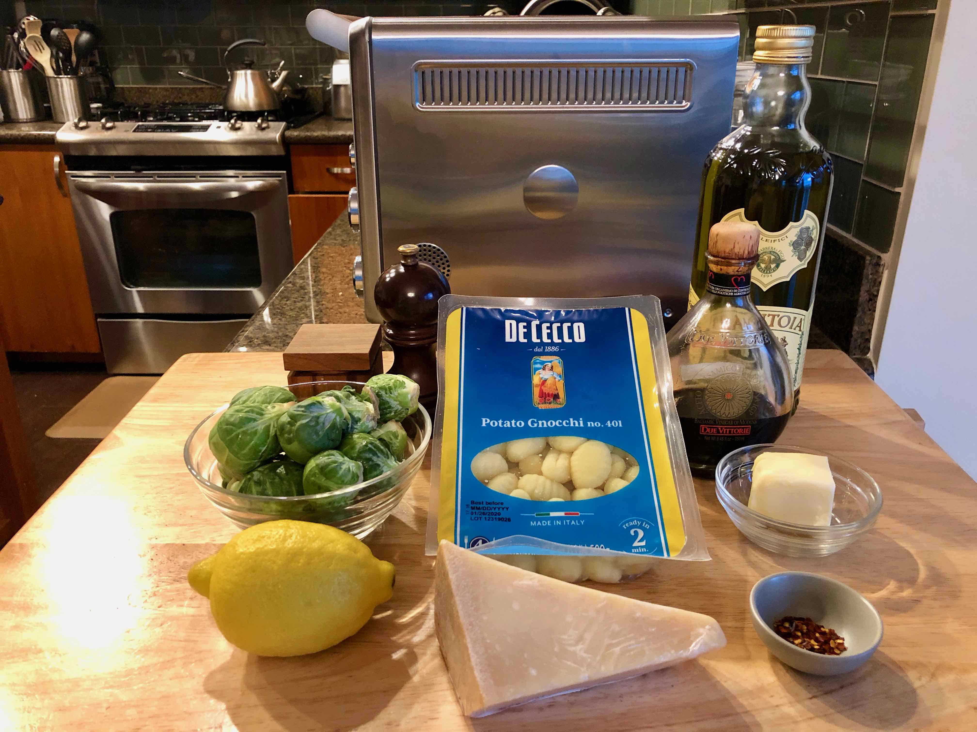 My first encounter with these store-bought gnocchi occurred last December after reading about them on John Fodera’s wine blog Tuscan Vines. With some skepticism, I prepared his recipe for Gnocchi San Marzano and was pleasantly surprised by the quality of these potato gnocchi from the famed pasta producer De Cecco.  Given my success, I subsequently purchased quite a few packages of them, the last of which provided the opportunity to take a stab at the Times recipe. The only ingredient I needed to purchase was a pound of Brussels sprouts.