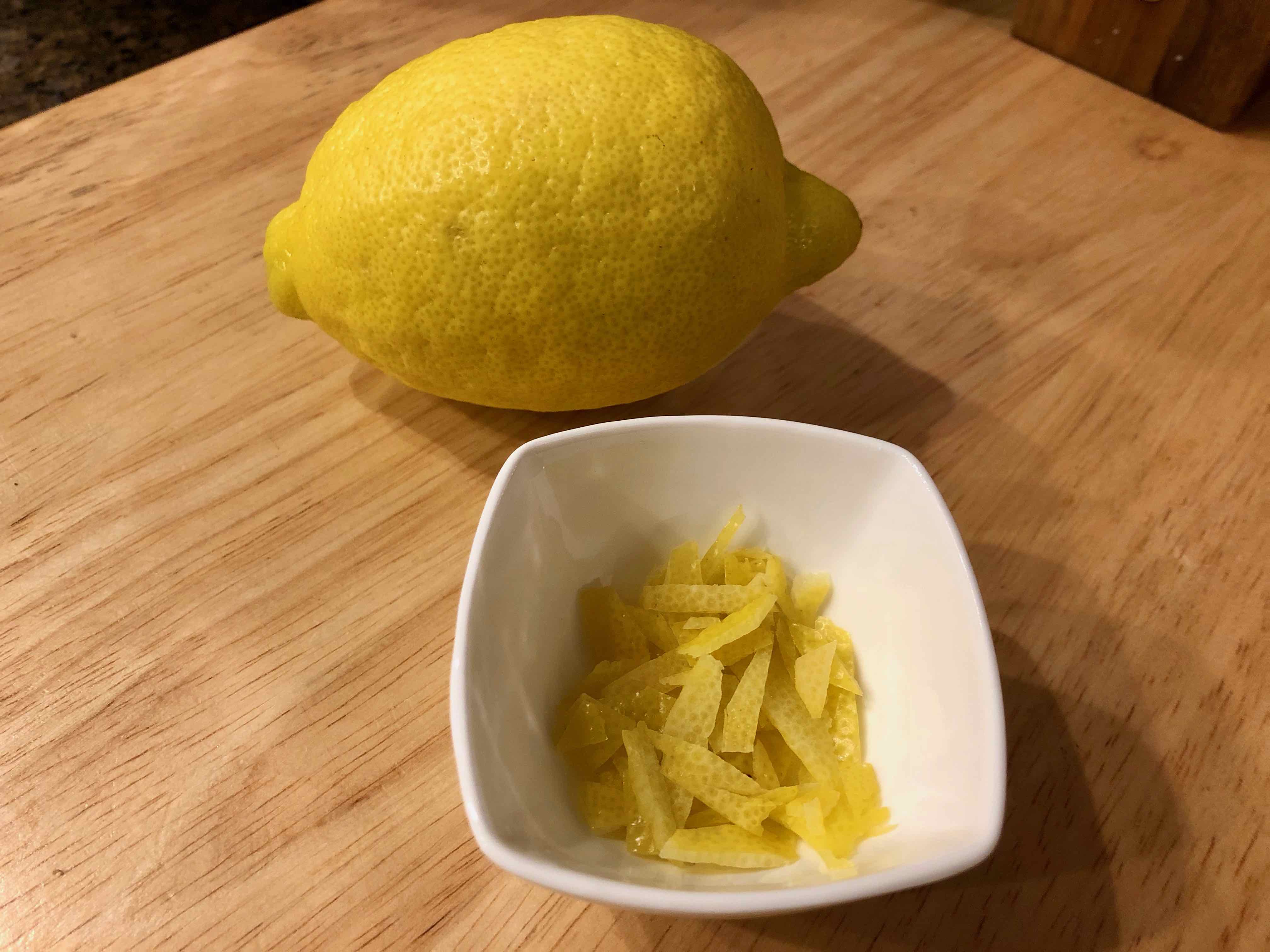 2. Using a vegetable peeler, peel thick strips of lemon zest, then coarsely chop. (You should have about 2 teaspoons chopped zest.)