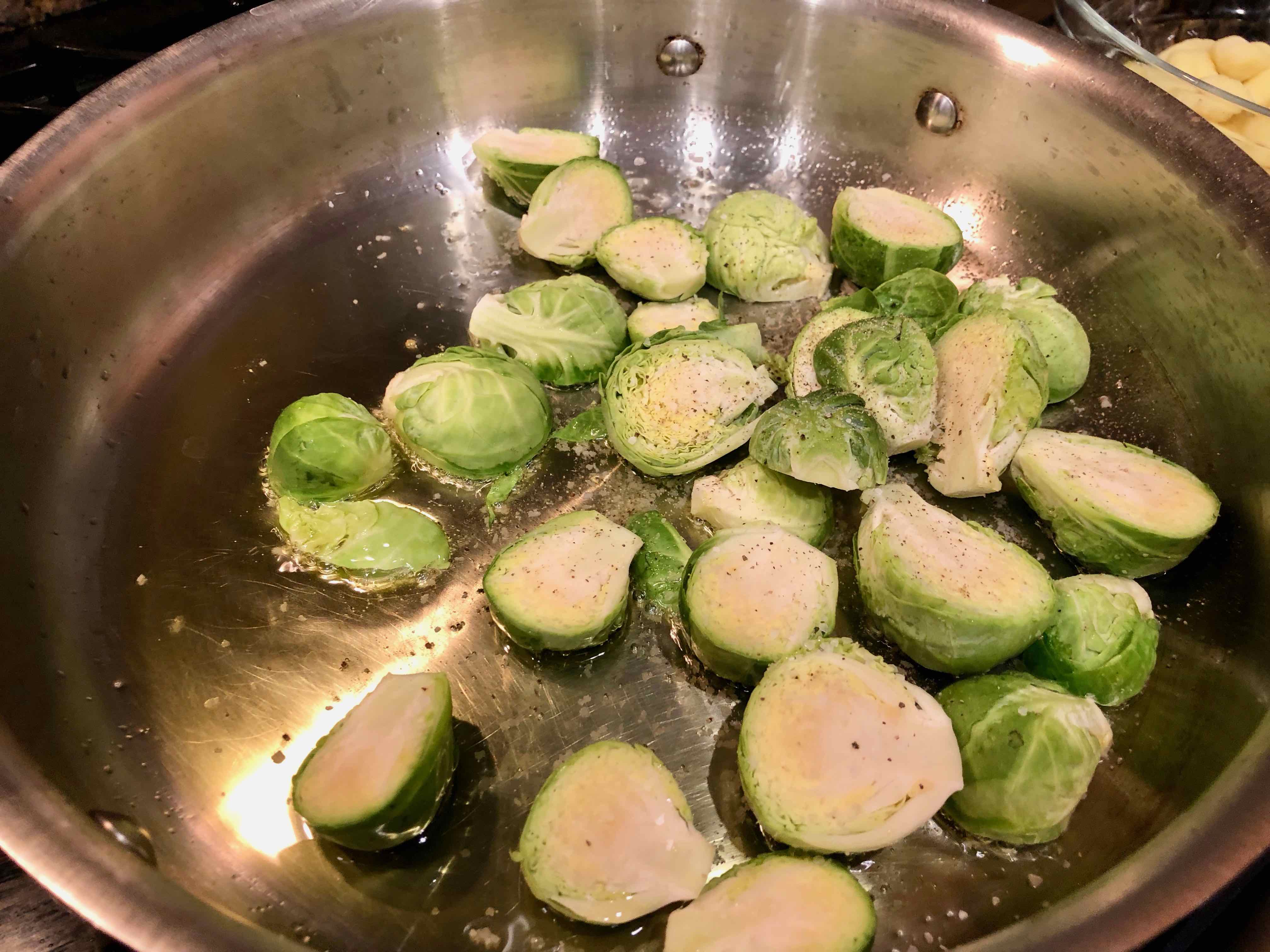 4. Add the brussels sprouts, season with 1/2 teaspoon salt and a few grinds of pepper, then arrange the brussels sprouts in an even layer, cut-side down.