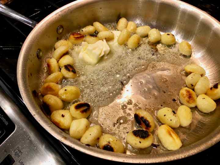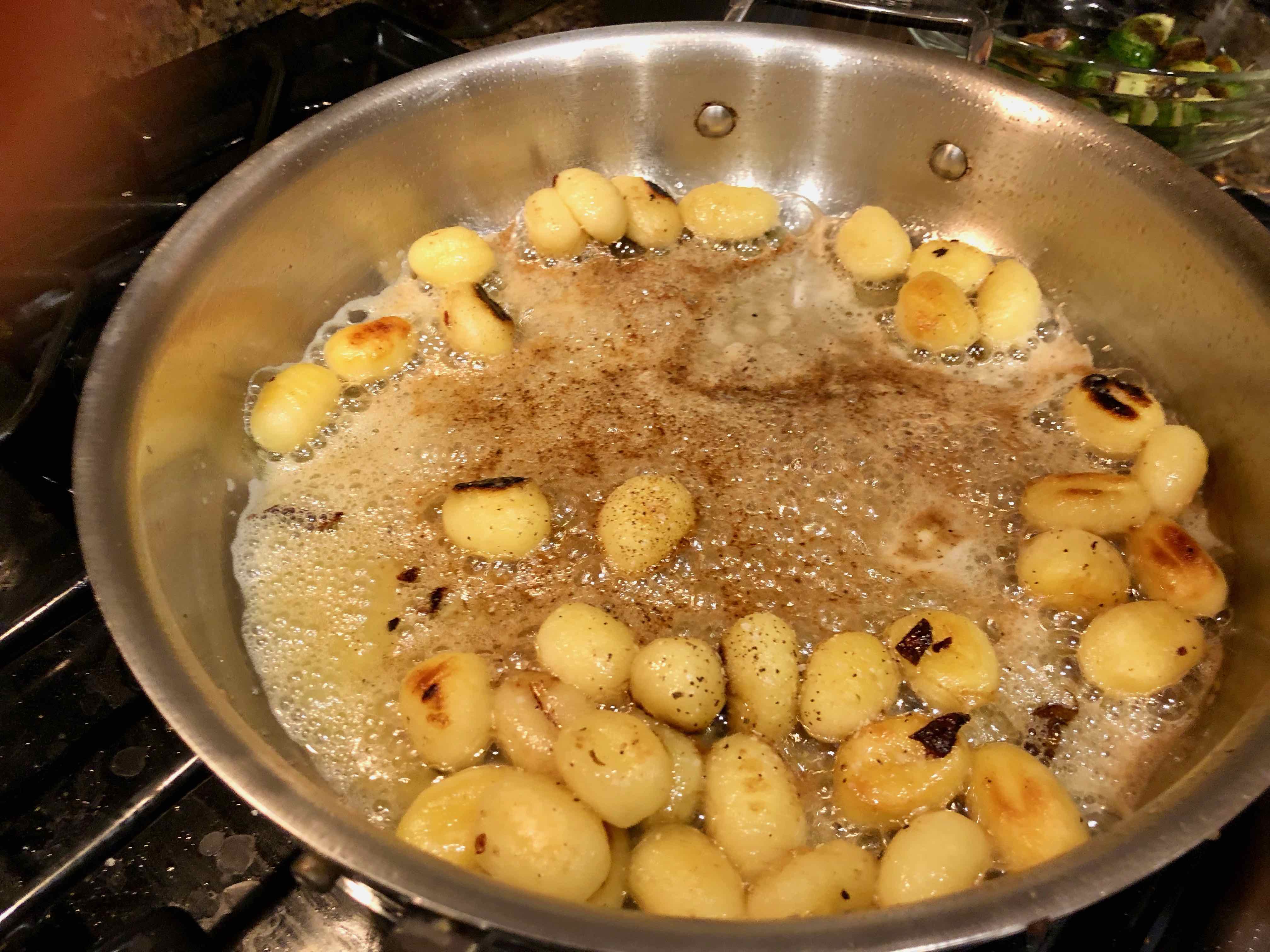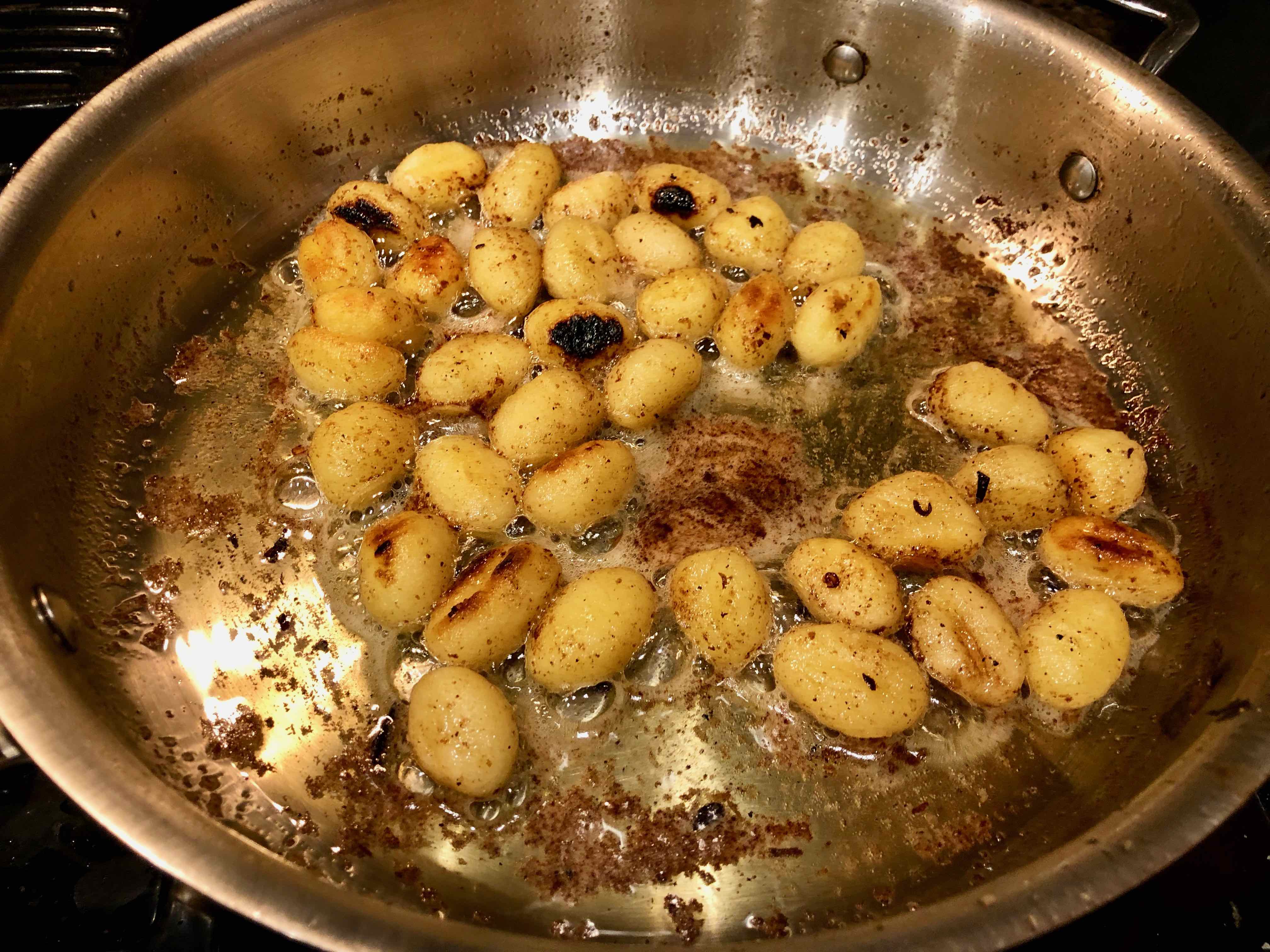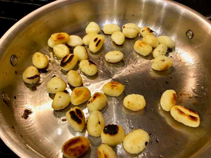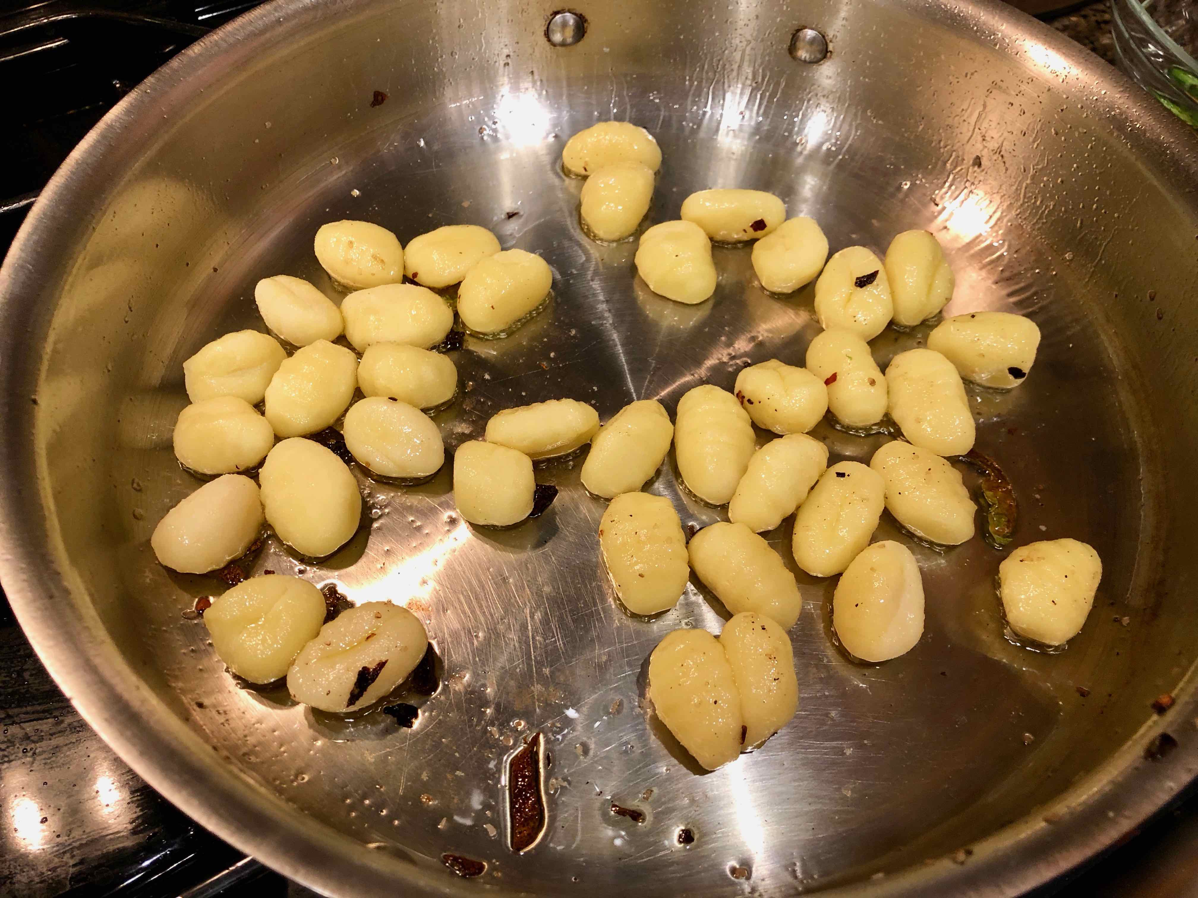 9. Break up any gnocchi that are stuck together, add them to the pan and cook, over medium flame, covered and undisturbed, until golden brown on one side, 2 to 4 minutes.