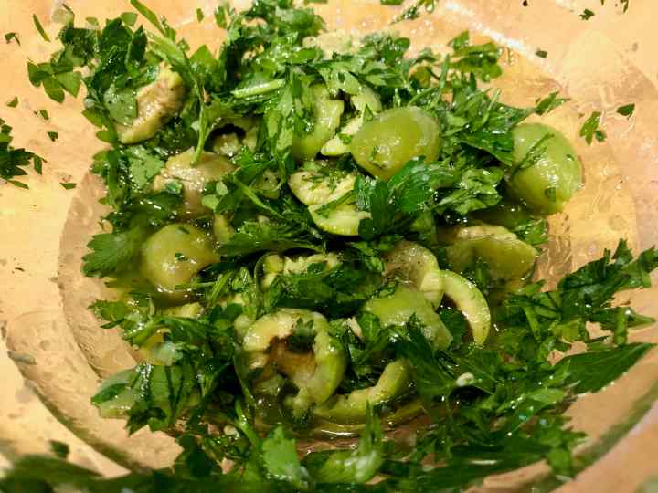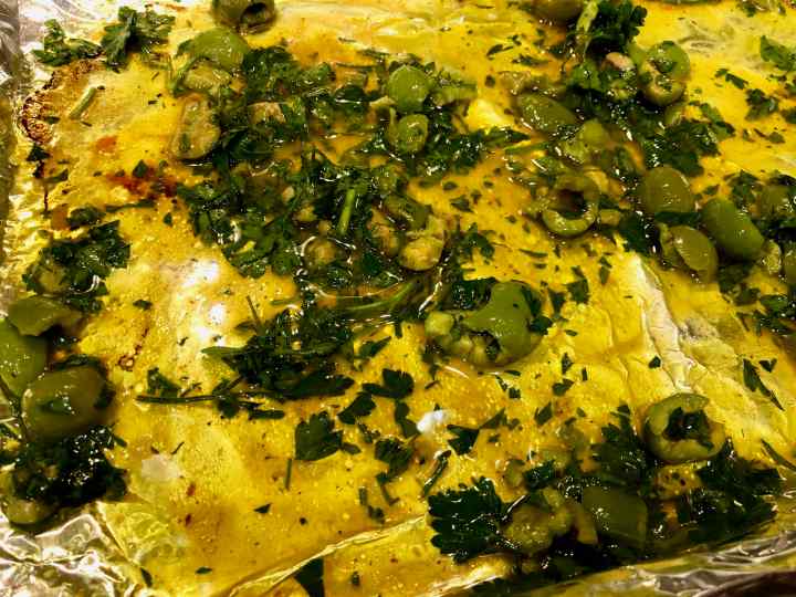 As with any first attempt at a recipe, I thought there were ways it could be improved to meet personal taste. Because we both enjoy the flavor of turmeric, I used the full amount called for and then some, even though I was halving the recipe. I did the same with the amounts of olives, parsley, and olive oil when making the sauce. I find that, especially with sauces, you have to use your eye to determine the measure of ingredients.