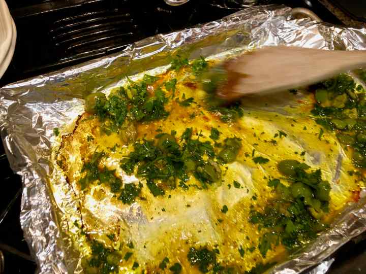 8. Using a spatula or wooden spoon, gently scrape up all the bits the chicken left behind, letting the olive mixture mingle with the rendered fat and get increasingly saucy. Pour olive mixture over the chicken, then serve. (Next time, I’ll forego the aluminum foil, which should allow for easier scraping and browner bits.)