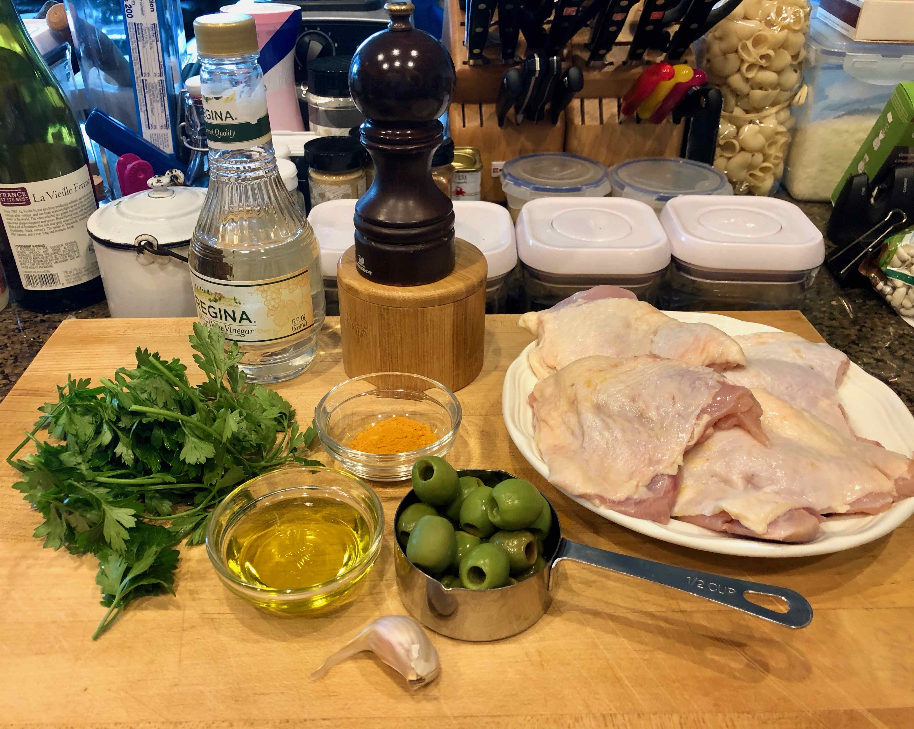 Vinegar Chicken with Crushed Olive Dressing (adapted for 2 servings from a recipe by Alison Roman on the New York Times “Cooking” Website)
