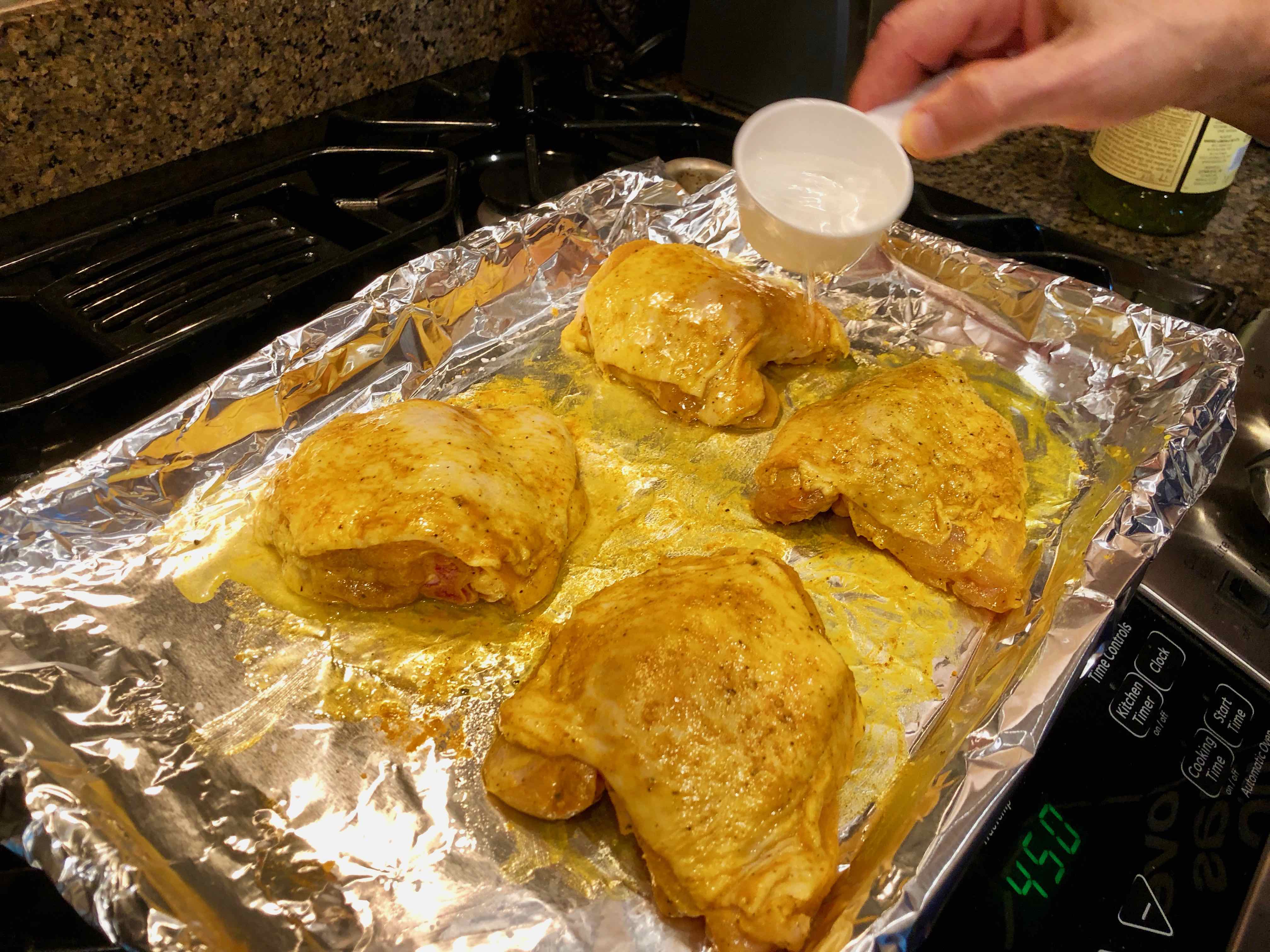 3. Make sure chicken is skin-side up, then pour vinegar over and around chicken and place in the oven.