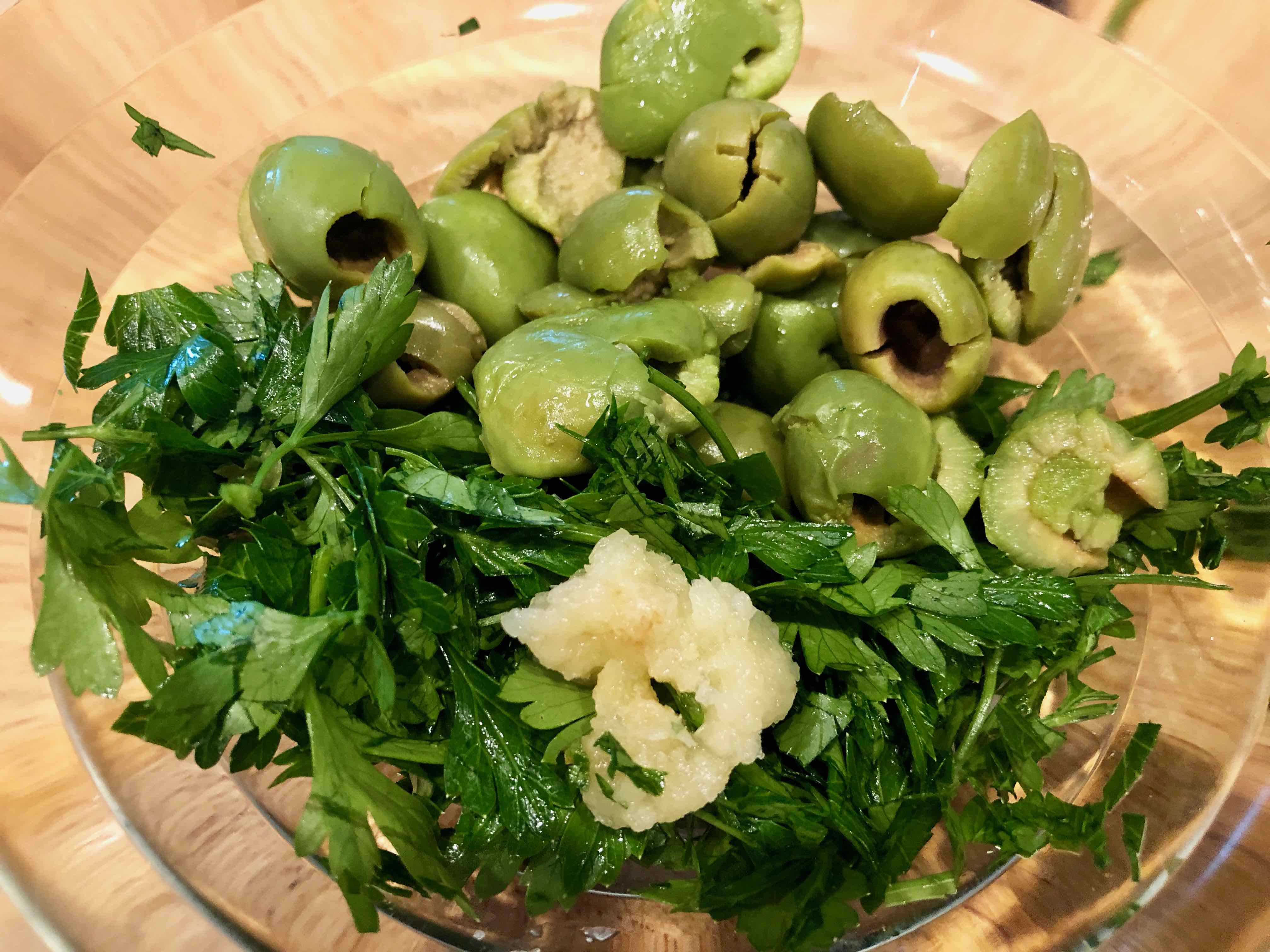 5. Meanwhile, combine olives, garlic, parsley, the remaining 2 tablespoons olive oil and 2 tablespoons dry vermouth in a small bowl; season with salt and pepper.